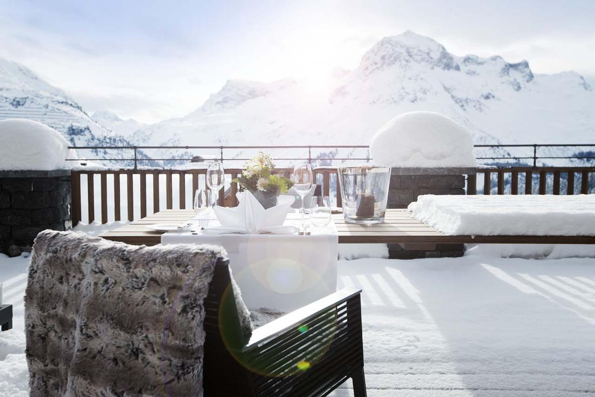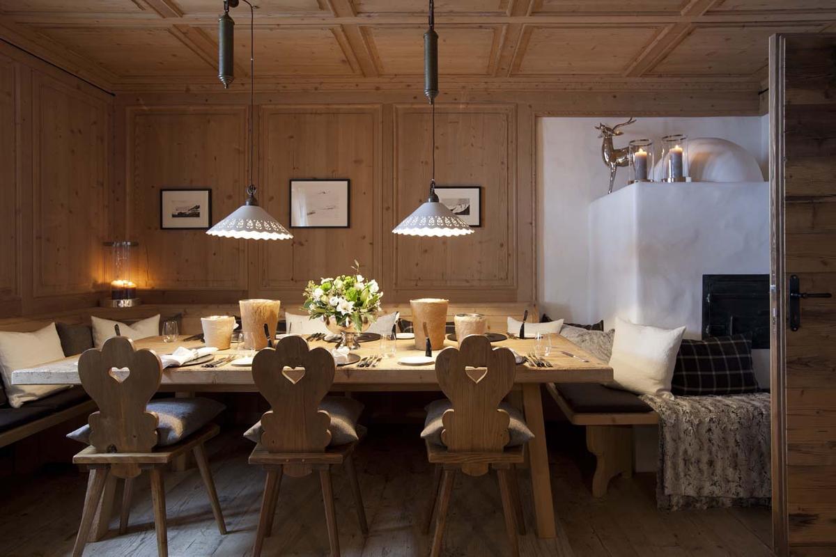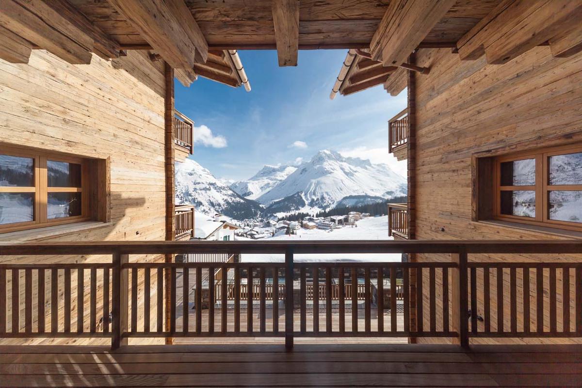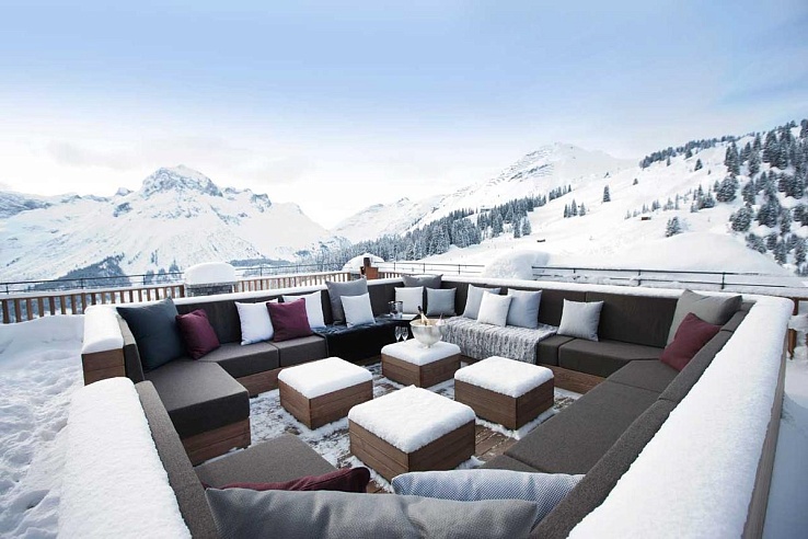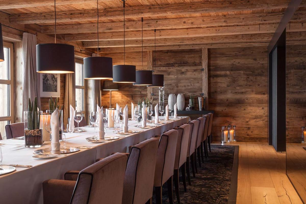 Upon entering the ground floor, guests are greeted by a spacious living room leading to a cozy fireside lounge and bar enclosed by floor-to-ceiling bulletproof windows, as well as two expansive dining areas. The expansive terrace is a visual treat, featuring multiple seating areas, a bar, an outdoor hot tub, and sweeping 180-degree vistas of the mountains and the village of Lech below.