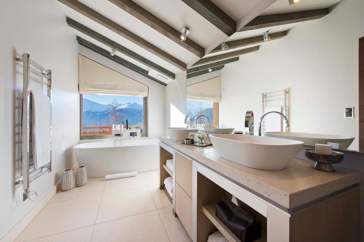 The main living area, located on the first floor, has been fully refurbished for the 2023/24 season. It features a cozy lounge, two dining spaces, and a sleek, modern kitchen. Large doors lead to a spacious terrace, now equipped with a new outdoor hot tub and bar, offering a stunning setting to take in the panoramic views of the Grand and Petit Combin massif.