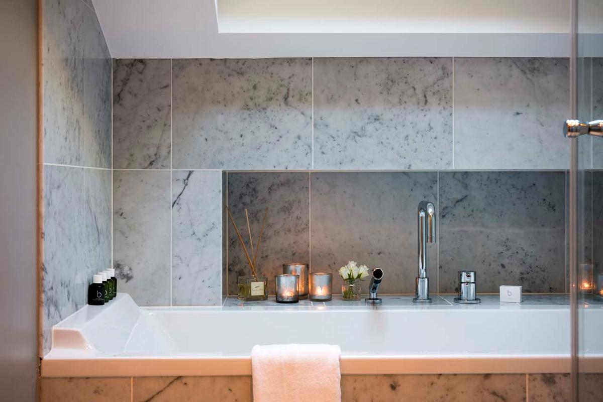 1 Master suite with seating area, private balcony, and an en-suite bathroom with freestanding bathtub and walk-in shower.