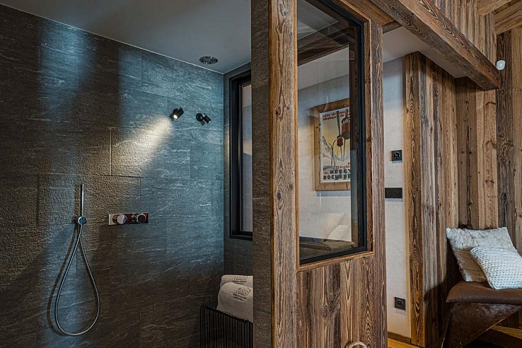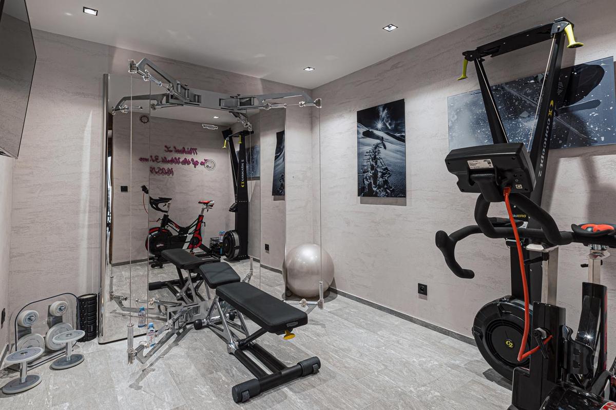 Take the stairs up to a mezzanine with a pool table and TV, offering views of the charming Old Village. The underground floor of the chalet unveils a luxurious spa haven, featuring an indoor pool, stone jacuzzi with tiled armchairs, hammam, a spacious Italian shower, and fitness equipment. Additional amenities include a wine cellar, laundry room, and garage.