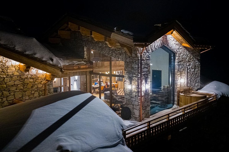 Chalet Orso is situated in the elevated village of Le Fornet, within walking distance of the slopes. The lively center of Val d’Isère, featuring shops, restaurants, and bars, is a four-minute drive away. More dining choices can be found at the base of the Fornet gondola, a five-minute walk from the chalet, which provides direct entry to the Tignes-Val d’Isère ski area. The main snow front, where ski schools, beginner slopes, and major lifts like the Solaise gondola and Olympique cable car are located, is reachable in five minutes by car.