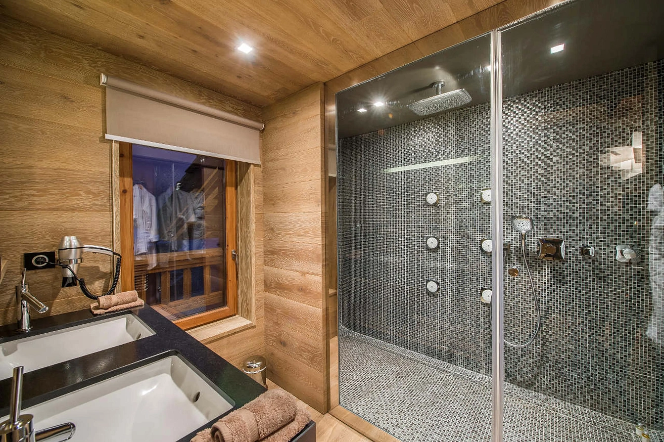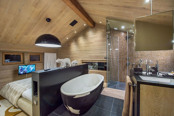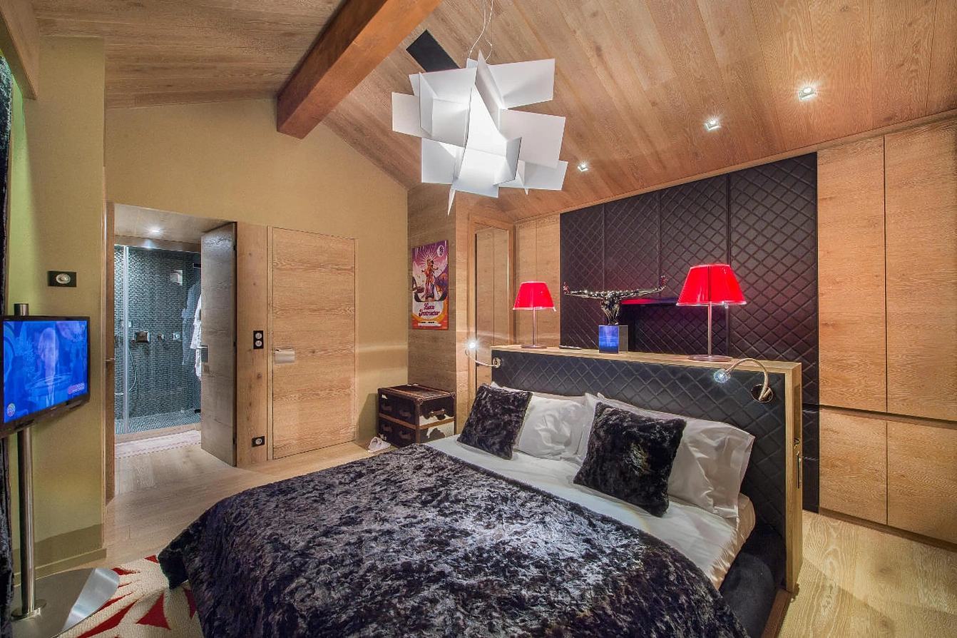 The chalet’s sleeping quarters are a study in Alpine chic. The top floor is dedicated to two magnificent master suites, each featuring king-size beds, vaulted ceilings, dressing rooms, and dedicated office areas. One boasts an open-plan bathroom with a freestanding tub, while the other offers a private balcony with commanding mountain vistas. On the ground floor, three further bedrooms—one double and two twins—provide versatile accommodation, each with its own distinctive character and en-suite bathroom, ensuring comfort and privacy for all guests.