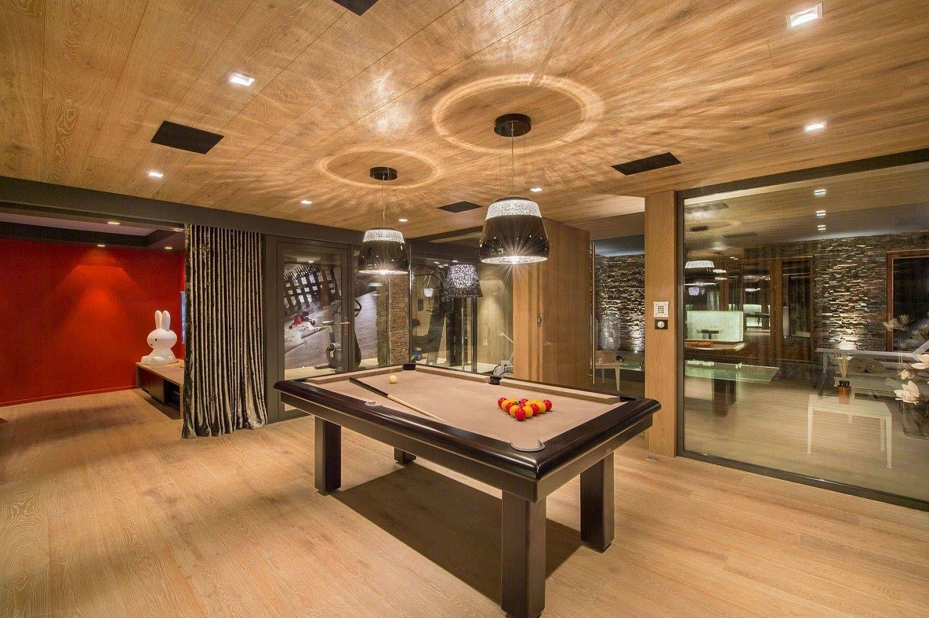 The lower level is a dedicated haven for relaxation and entertainment. The wellness area centres on a generous sunken Jacuzzi, complemented by a hammam, a fully-equipped gym, and a private massage treatment room. Adjacent, the entertainment suite beckons with a full bar, a pool table, and a sophisticated cinema room complete with a large screen and ambient lighting, perfect for movie nights after a day on the slopes.