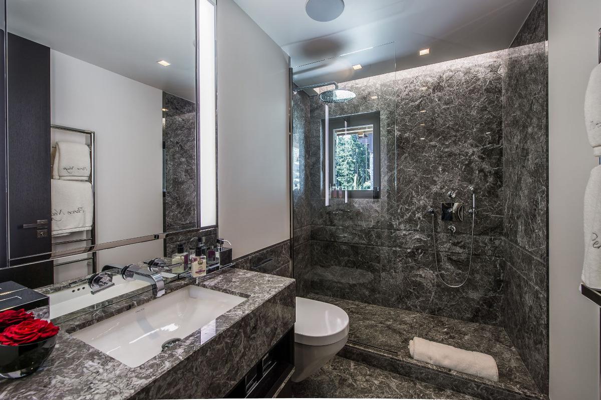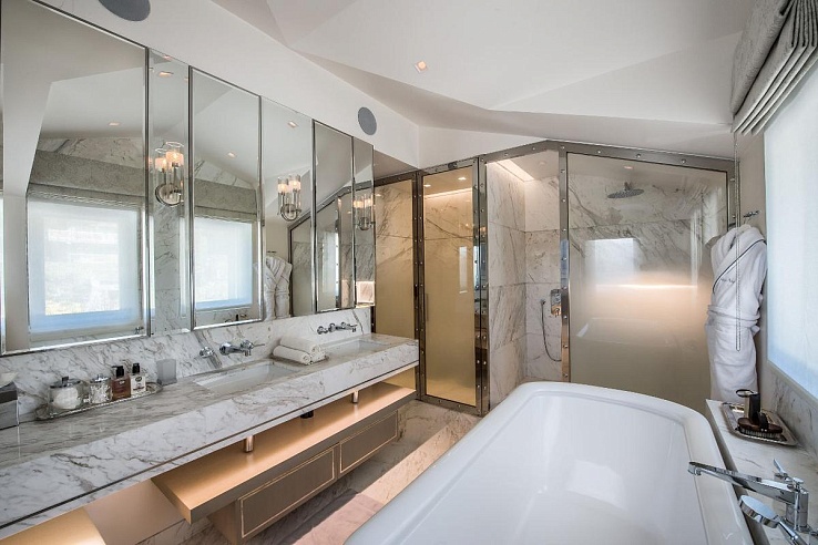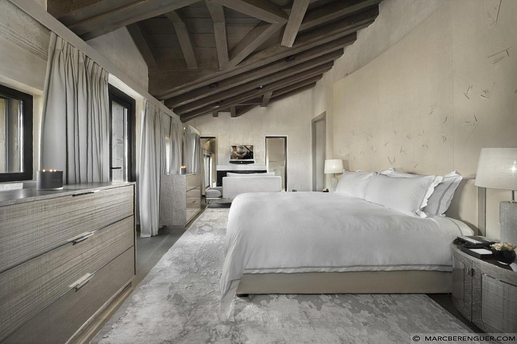 Spanning Over three floors, the eight luxurious bedrooms accommodate 14 adults and four children. The master bedroom suite, adorned with stylish furnishings, features a king-size bed, ethanol fireplace, dressing room, balcony, and private bathroom.