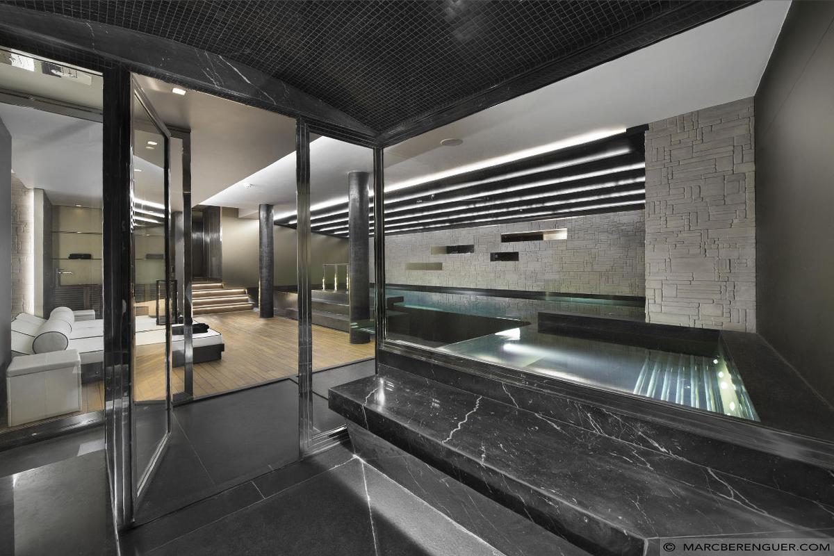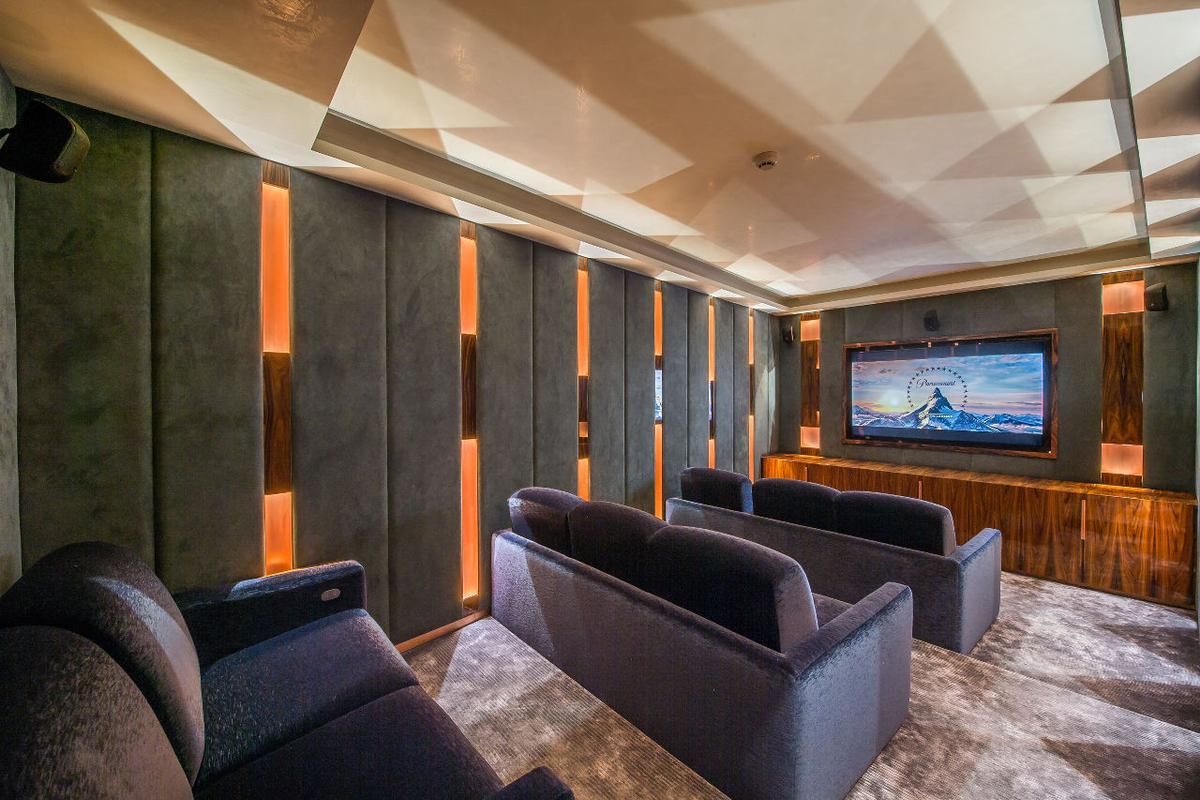 Cour81's wellness area is a masterpiece, featuring a modern 10 x 3 metre infinity-edge pool, a Jacuzzi (for up to six people), a steam room (for up to eight people), and a massage room. The tranquil haven includes an additional lounge with an ethanol fireplace, a bar, and a games room equipped with a flat screen TV, pool table, pinball, and table tennis. The chalet also boasts its own eight-person home cinema theatre with reclining chairs. An outdoor hot tub for eight people adds to the allure.