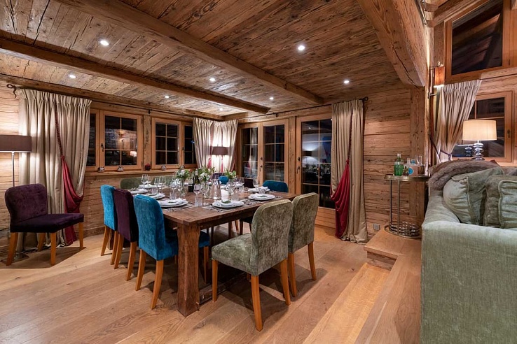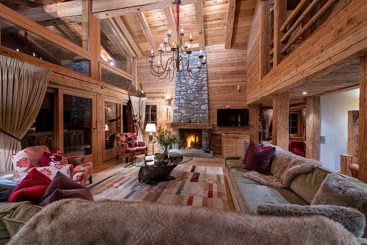 Upon entering the chalet on the ground floor through a spacious ski room equipped with heated boot warmers, guests are welcomed into the main living and dining area on the second floor. With double-height vaulted ceilings, this space is adorned with sumptuous sofas surrounding a roaring log fire and sliding glass doors that allow ample natural light while providing access to stunning views.