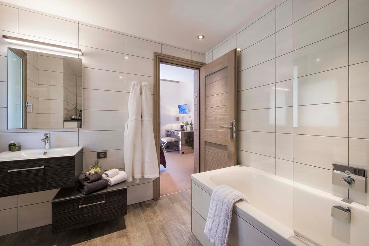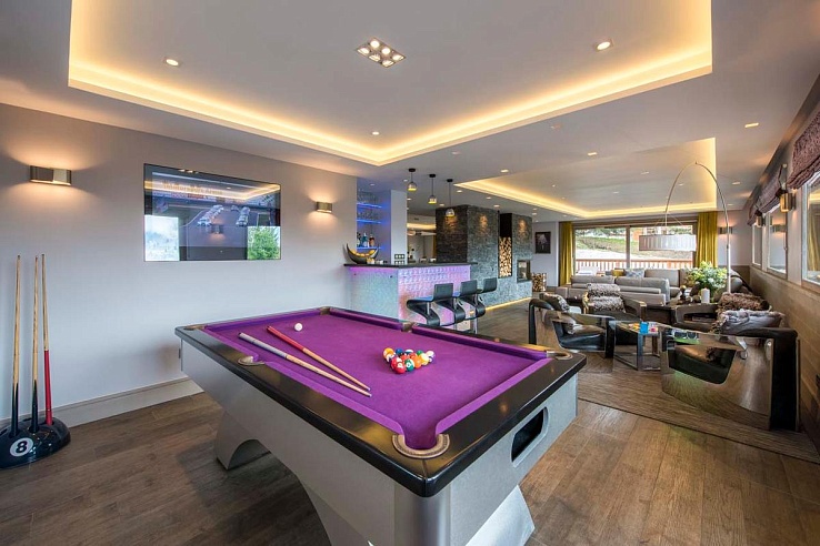 The spacious open-plan living area dominates the first floor, featuring a cozy wood-burning fireplace, a lounge area, and a separate seating nook. Large windows offer stunning views of the Meribel Valley, while the southwest-facing decked terrace provides an ideal spot to savor the crisp mountain air. Guests can unwind at the champagne bar for après-ski drinks or enjoy a friendly game of pool. An elegant dining area comfortably seats 14, complemented by a well-appointed kitchen.