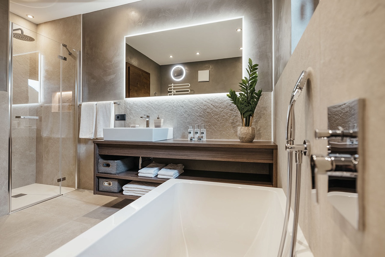 Indulge in the exclusive private wellness area, complete with a heated swimming pool improved integrated whirlpool, sauna, and relaxation room—all framed by sweeping views of Val Gardena’s peaks. A spacious terrace offers sunbathing space, while an additional double bedroom provides flexible accommodation. Sauna towels, bathrobes, and slippers are provided throughout your stay.