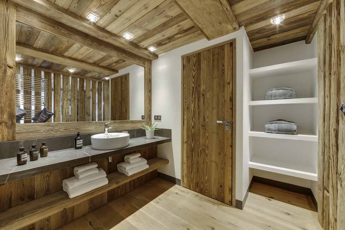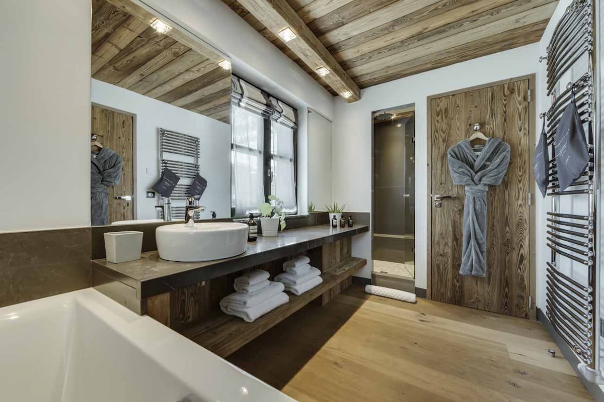 Accommodating up to eight adults and two children, the chalet's five stylish bedrooms are designed for comfort. The second floor houses a master bedroom with a small lounge area and a private bathroom, along with an additional room with double or twin beds. On the first floor, there are three more bedrooms: two can be configured with double or twin beds, and the third is a children's room with a bunk bed.