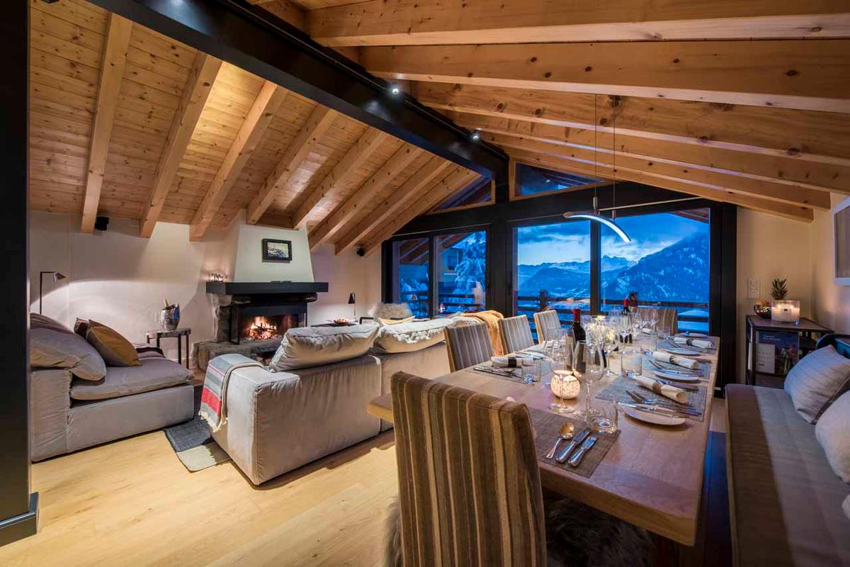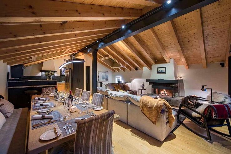 The spacious, alpine-inspired open-plan living area is located on the top floor, accessible by either lift or stairs. It features a vaulted ceiling, an open stone fireplace, and double-height French windows that open to a south-facing balcony. The dining area, which seats ten, is complemented by a well-equipped kitchen.