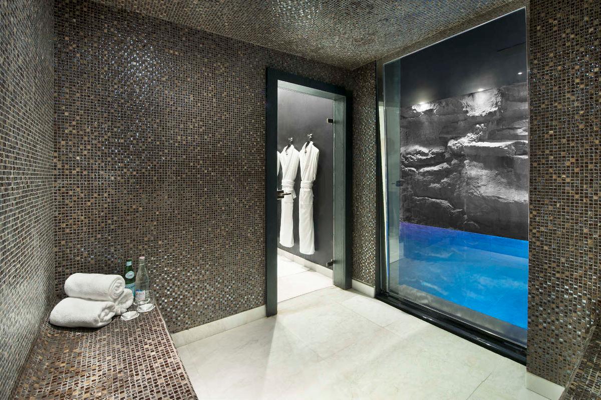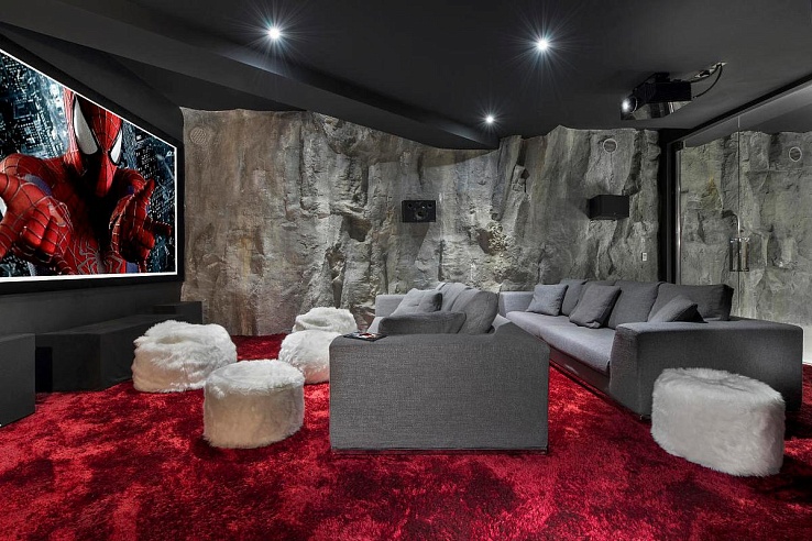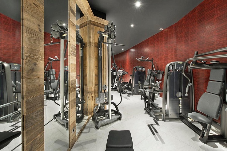 The chalet has a fantastic spa and fun area on one of the lower floors. It keeps the cosy mountain feeling with its high, arched ceiling and natural stone walls.. The spa features a 15m x 3m indoor swimming pool, a giant Jacuzzi and a modern hammam, where guests can unwind after a long day on the slopes. The spa also has a private massage room and a gym with a wide variety of equipment. The entertainment area includes a cinema room with its fluffy red velvet carpet and comfortable seating.