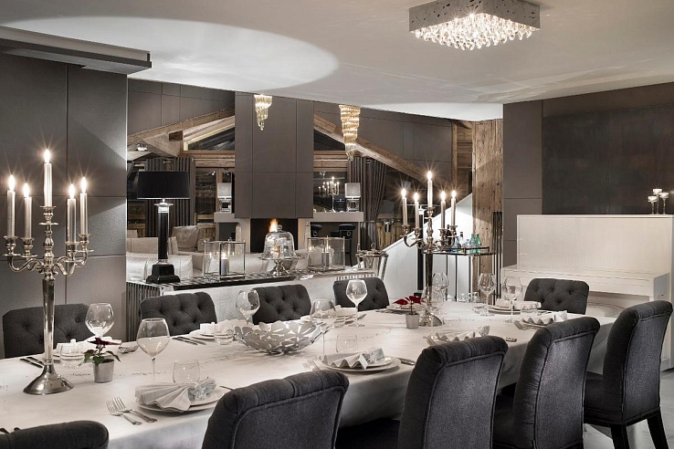 The dining area is elegant and refined, with a large wooden table that can seat up to 16 guests. Next to the dining area is a piano for evening entertainment and relaxation. The living area also has terrace access, where guests can enjoy the stunning views of the mountains and the village.