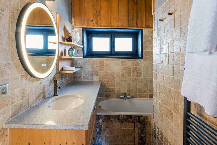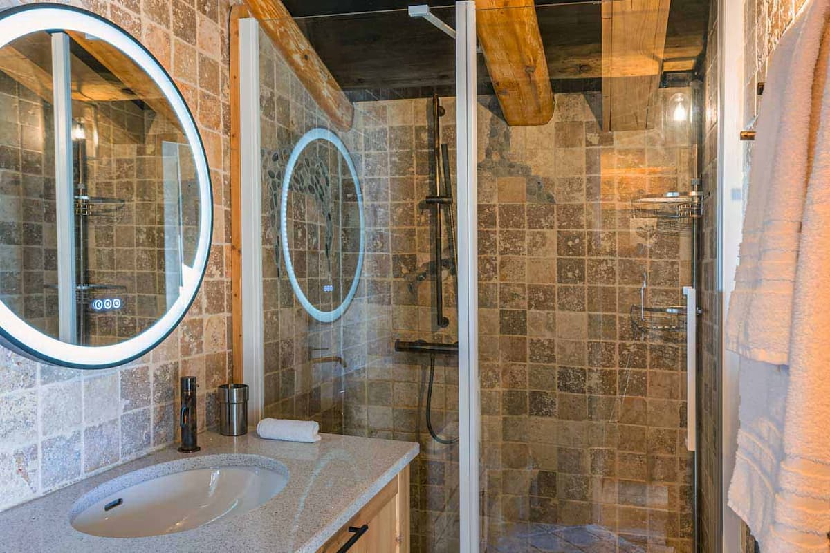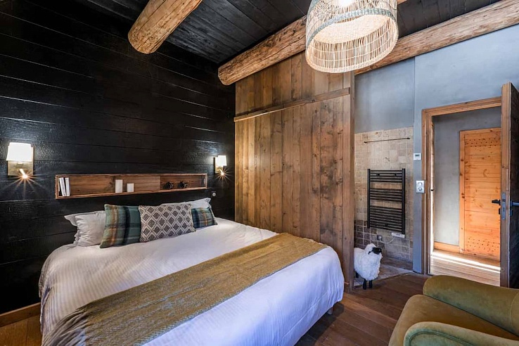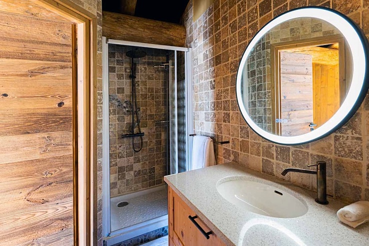 Each of the six thoughtfully designed bedrooms offers a tranquil sanctuary. Configured flexibly as doubles or twins to suit your group's needs, they provide restful comfort wrapped in the chalet's signature blend of modern amenities and rustic elegance. Two ground-floor bedrooms boast direct terrace access, inviting morning alpine air. The remaining bedrooms, situated across the first and top floors, ensure privacy and peace. Every room features its own en-suite bathroom, offering convenience and a touch of indulgence for all guests.