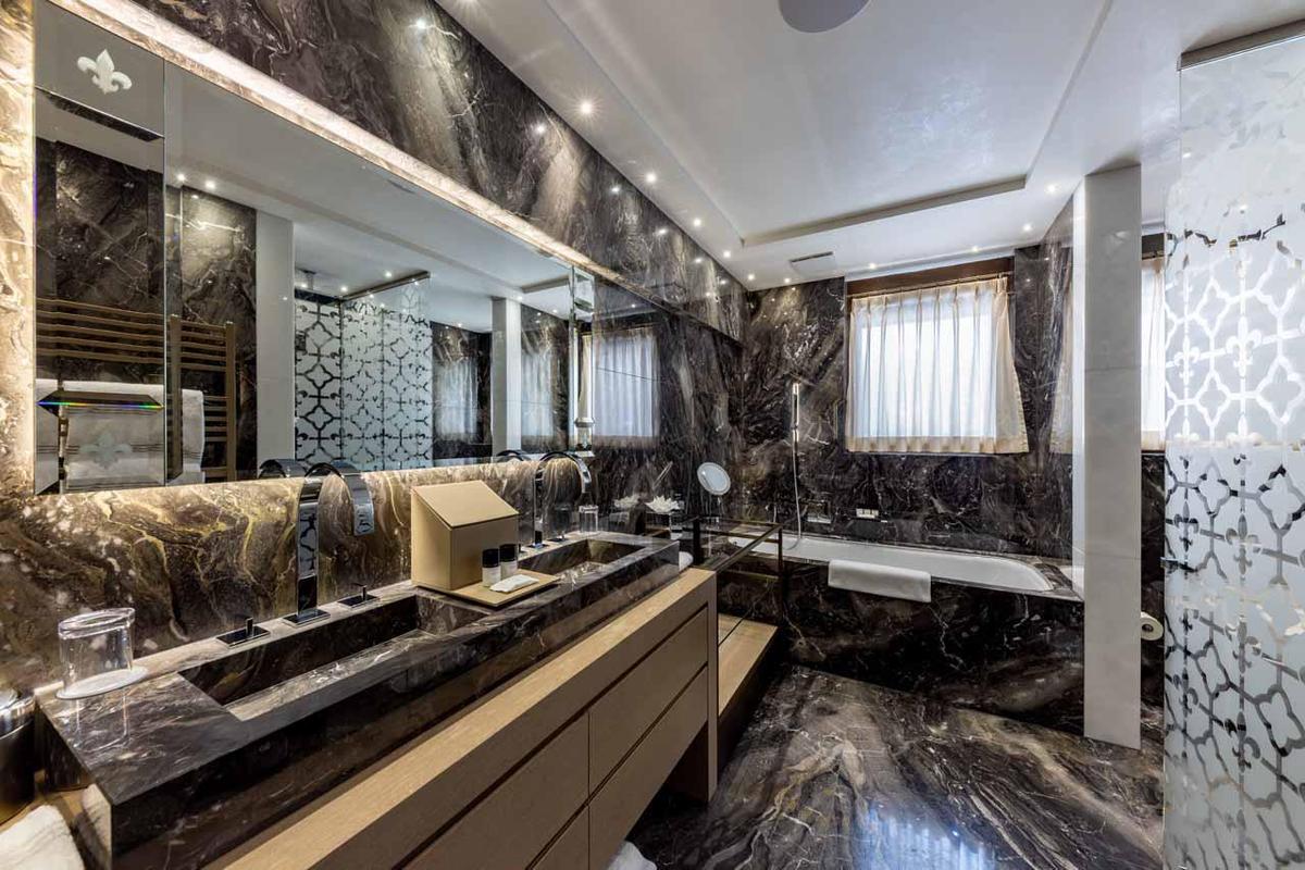 Chalet 1 grants direct access to the expansive spa and clinic, adorned with Bahia Blanca marbles, teak wood, and Baccarat crystal chandeliers. Here, guests can luxuriate in a traditional steam room and sauna, along with lounge beds for relaxation. Access to the superb outdoor pool and Ultima’s personalized clinical services enhance the experience, offering a range of tailored treatments.