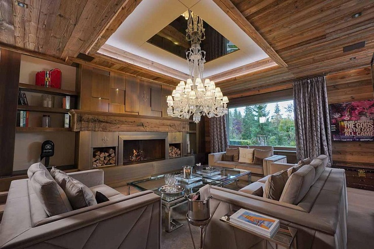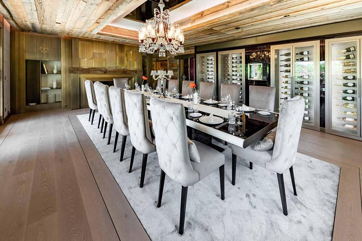 Blending historic architecture with modern flair, the chalet features a magnificent double living room and a stylish bar adorned in soft hues, accentuated by striking lighting and sumptuous sofas. An exquisite dining area caters to gatherings of up to 16 guests. Completing the ensemble is a professional kitchen, a cozy cigar room, and a billiard room.