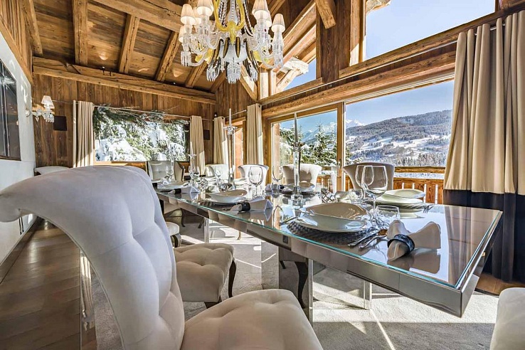 Ultima Megève offers an array of luxurious amenities, including a magnificent spa with a steam room, fitness area, massage rooms, and a swimming pool. Guests can unwind in the cinema room or dance in the private nightclub. A well-appointed wine cellar is also available.