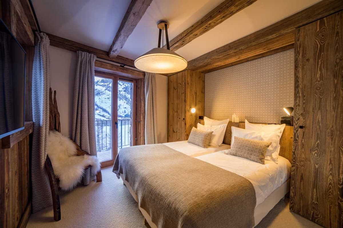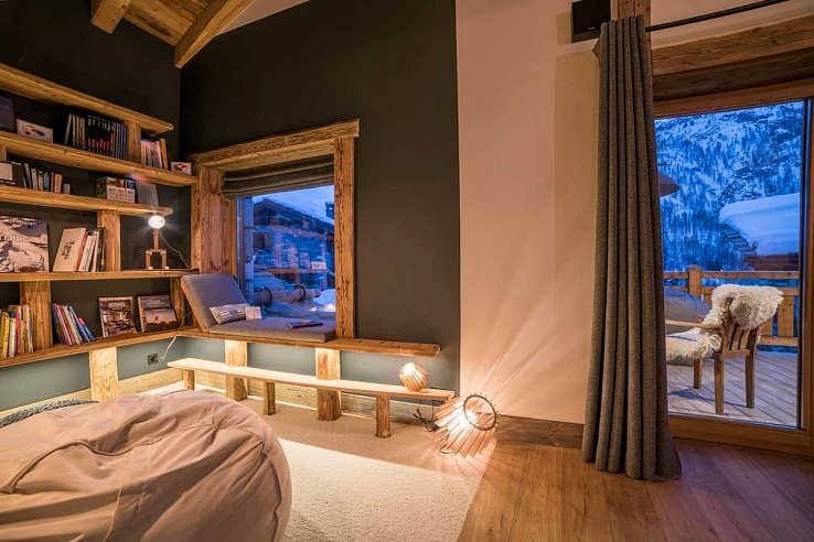 Upon entering, guests are greeted by an inviting open-plan living and dining area featuring a warm fireplace and expansive windows framing panoramic views of Solaise and Bellevarde. The dining table, accommodating up to 14 people, is complemented by a well-equipped kitchen with a breakfast bar and TV. A cozy reading corner offers a perfect spot for relaxation.