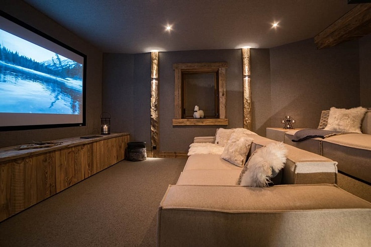 Following a day of skiing, the spa area beckons with its luxurious amenities, including a heated indoor swimming pool, hammam, and massage room. An outdoor hot tub provides an opportunity to unwind while soaking in the forest views. To enhance the entertainment options, the chalet features a cinema room equipped with Apple TV, Netflix, and a gaming console. Additionally, there is a heated ski room complete with glove warmers and direct access to the garage.