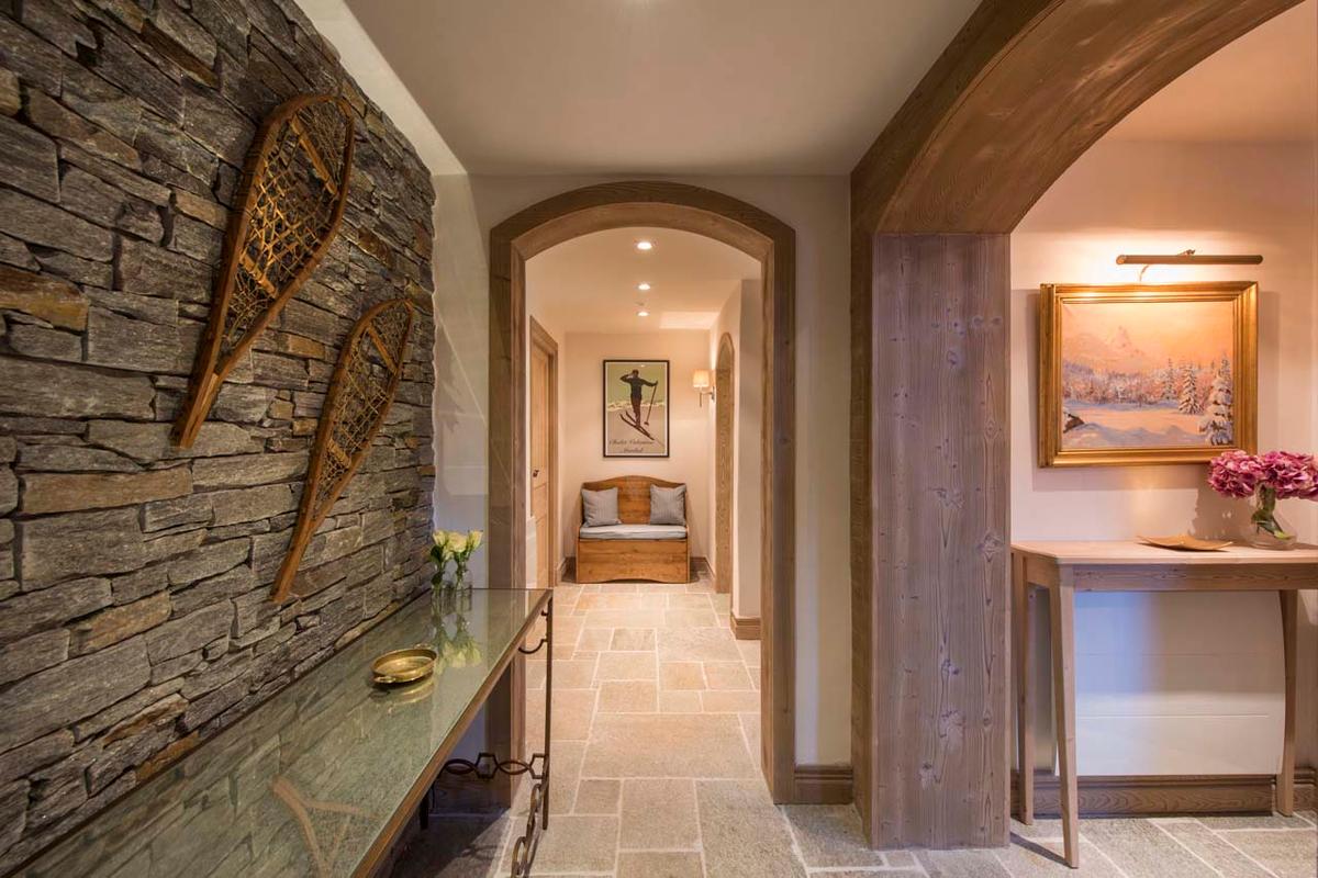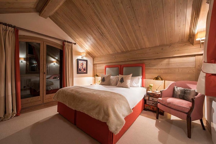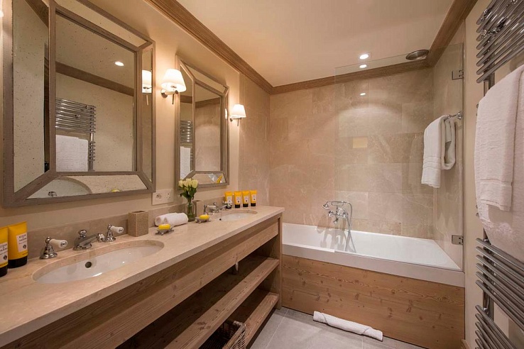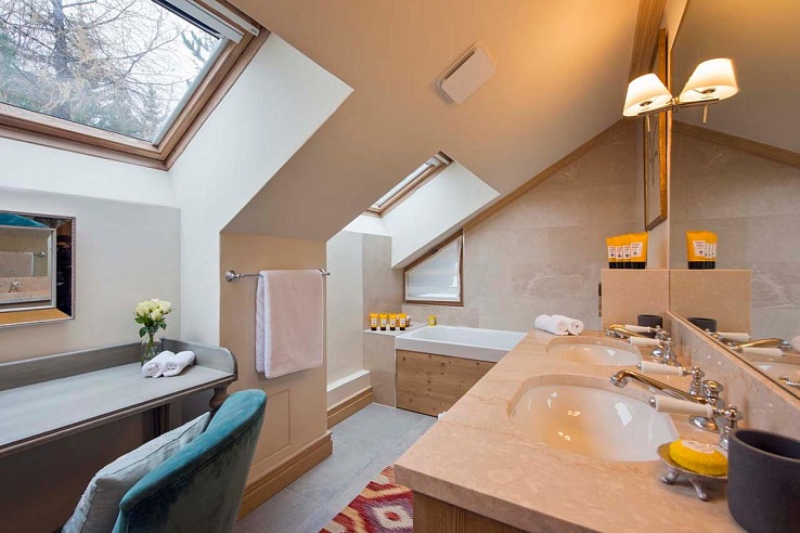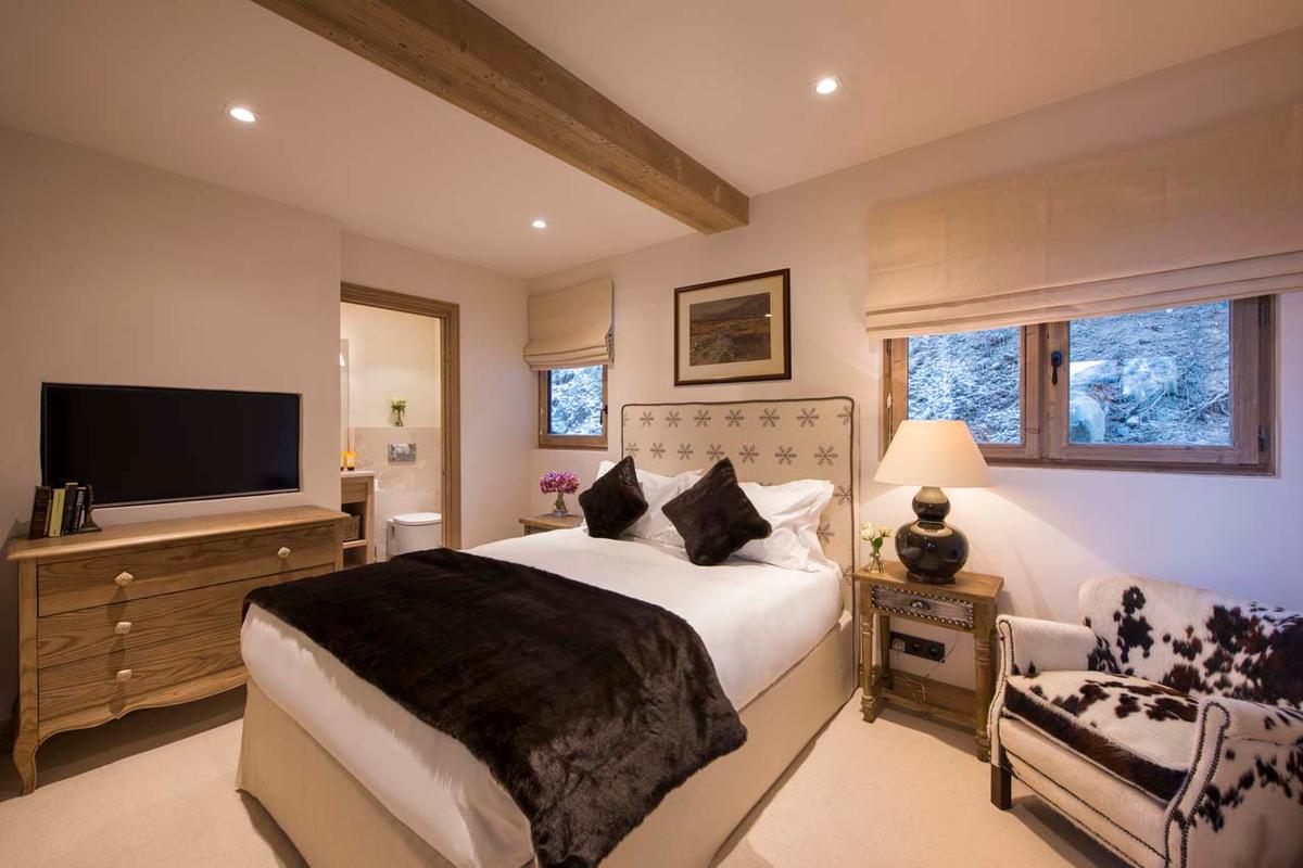 Three more twin/double bedrooms with ensuite bathrooms and a double bedroom with an ensuite shower room are also available. Additionally, there's a separate staff apartment on the first level with two live-in staff members. The chalet features a ski room equipped with heated boot warmers and offers parking for one vehicle outdoors and a garage with parking for one indoors.