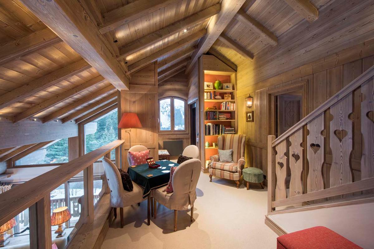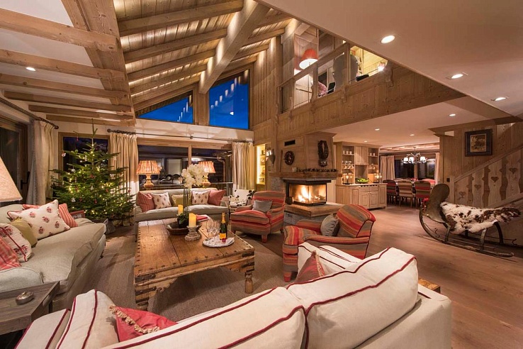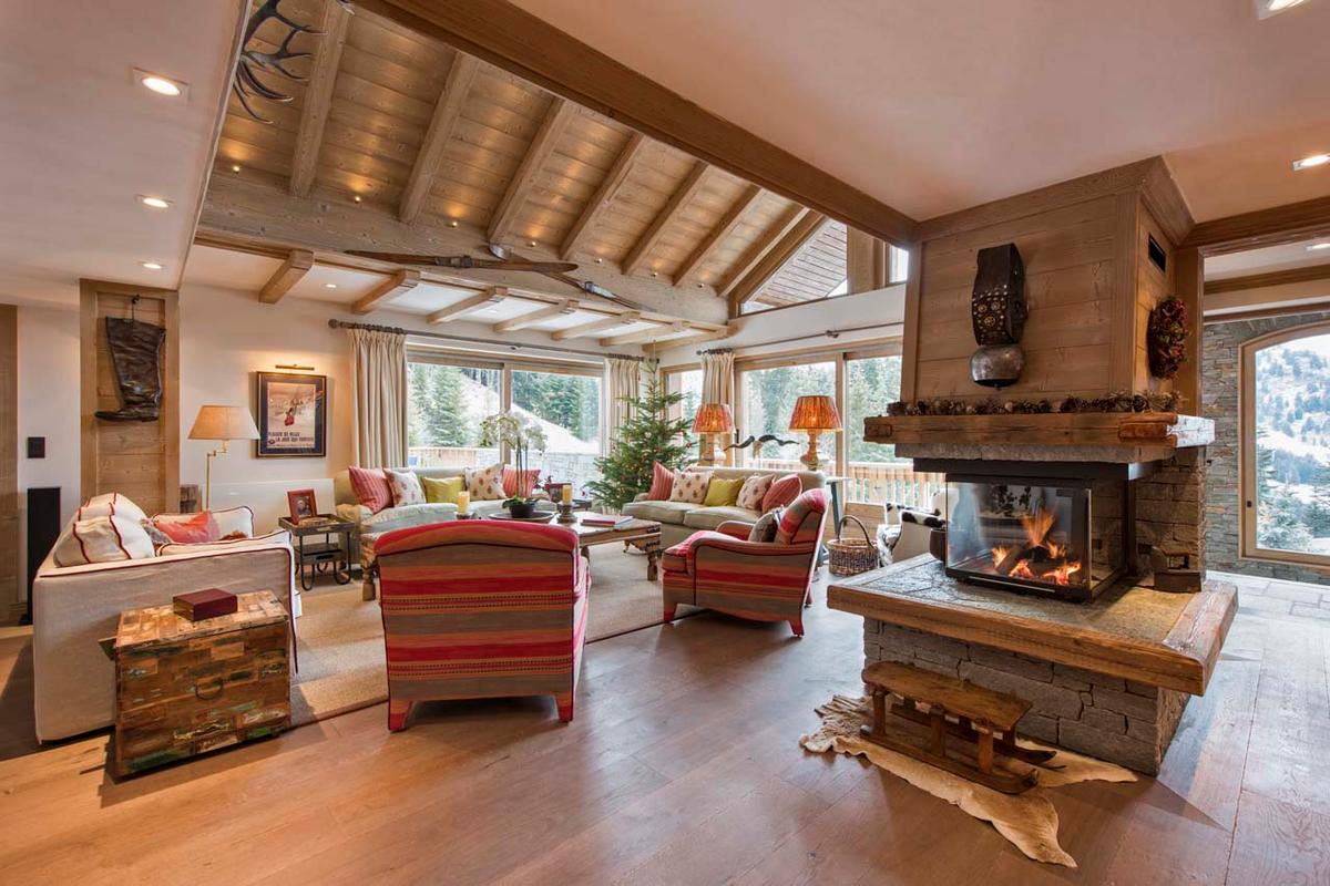 The chalet second level houses a generous open-plan living area adorned with floor-to-ceiling windows, offering breathtaking views of the distant snow-covered peaks. A central fireplace delineates the living space from the dining area, while a well-equipped kitchen and cozy snug complete this level.