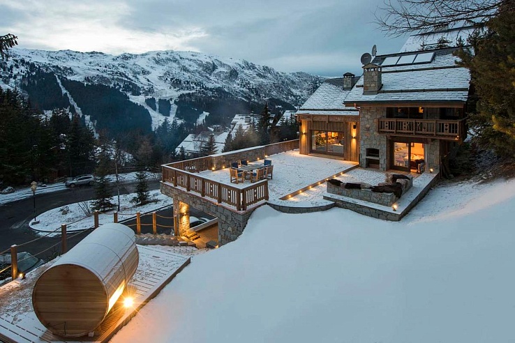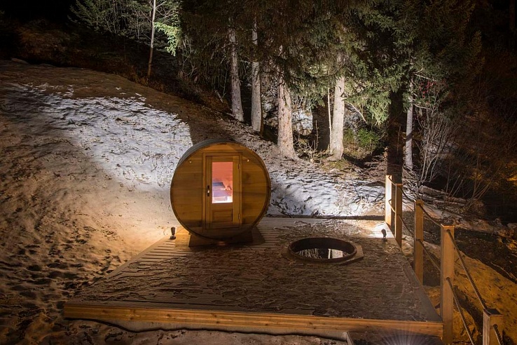 Step outside onto the expansive terrace featuring a fire pit surrounded by plush fur-covered seating—ideal for savoring toasted marshmallows and hot chocolate post-skiing. Additional outdoor amenities include a barrel sauna, plunge pool, and a hot tub on the first-level terrace.