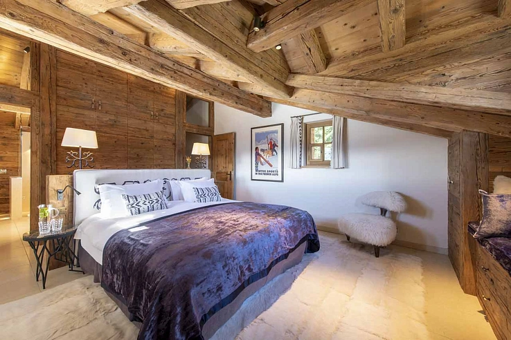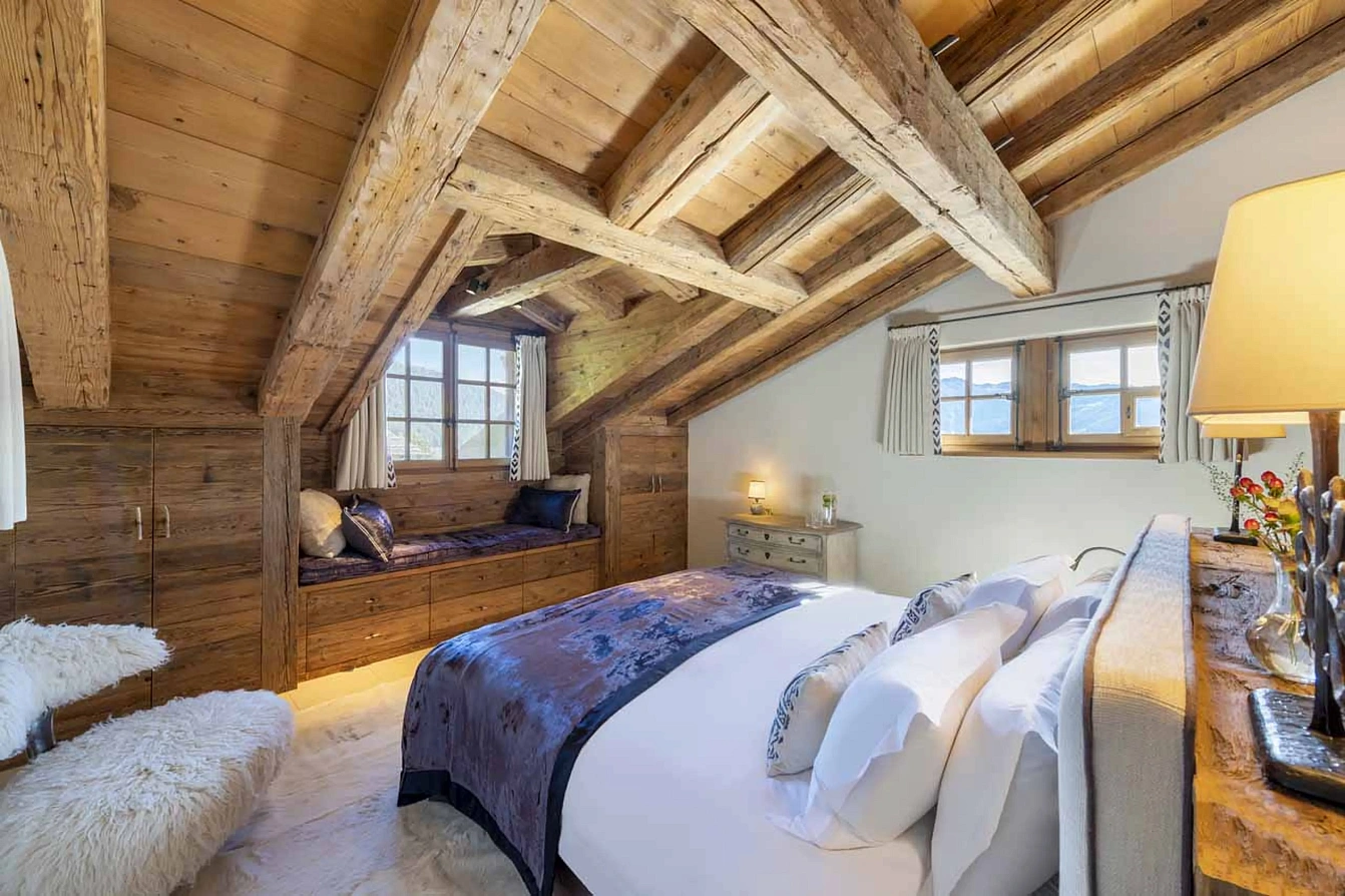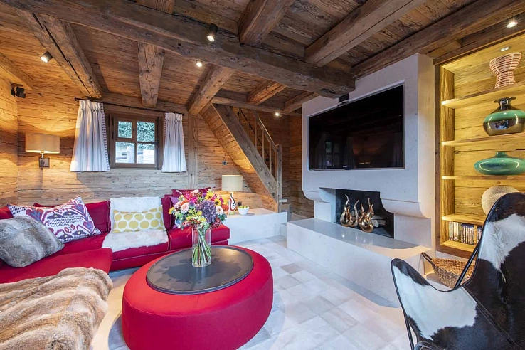 Verb469 is a charming stone-and-wood property set over four floors in a secluded location near the Chalet d'Adrien restaurant. Its interiors balance rustic alpine character with understated luxury, featuring exposed wood, cosy furnishings, and large, light-filled spaces. The heart of the home is the first-floor living area, where a stone fireplace, comfortable sofas, and floor-to-ceiling windows create an inviting atmosphere. This opens onto a balcony with sheepskin-draped chairs for soaking in the views. An open-plan dining area with a table for ten adjoins the fully-equipped kitchen, with direct access to a terrace for al fresco dining.