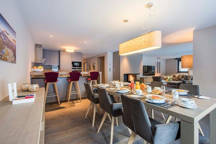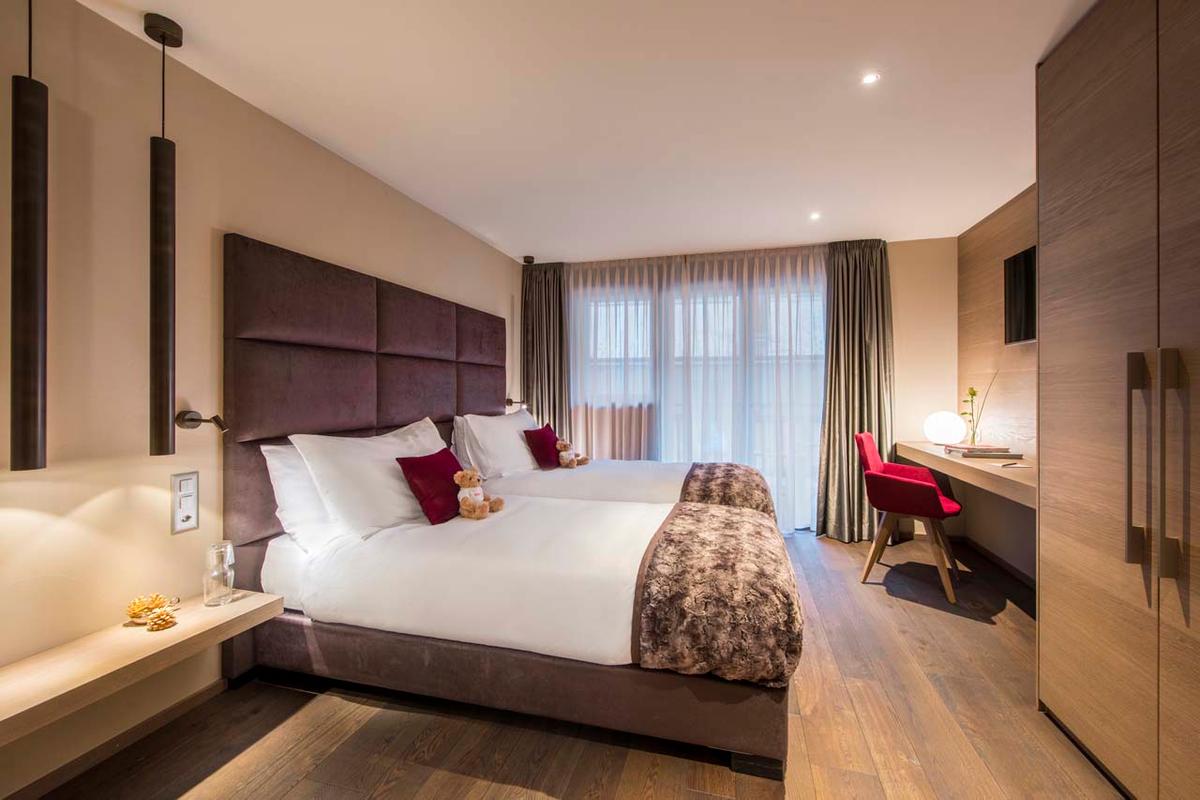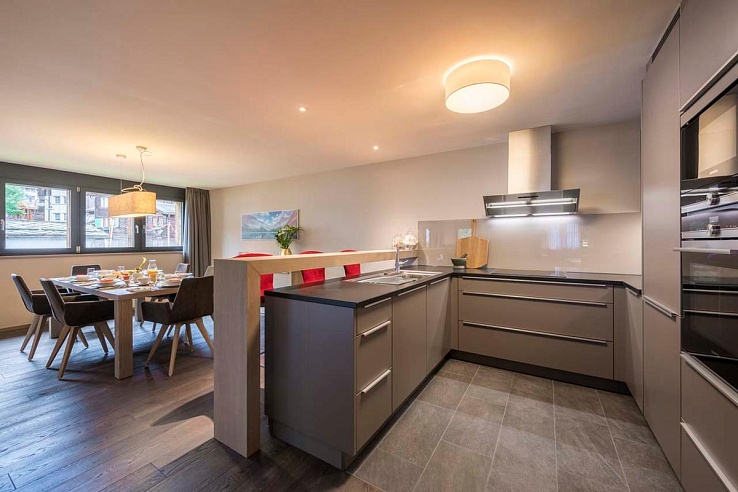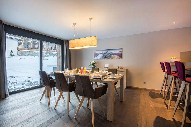 Zerm247 is conveniently located just 500 meters from the Matterhorn Glacier Paradise lift station and a short stroll from the village center. This prime location provides easy access to both the ski area and the numerous shops, bars, and restaurants. This three-bedroom apartment, which can host up to six people, is perfect for families seeking an elegant retreat in the heart of Zermatt.