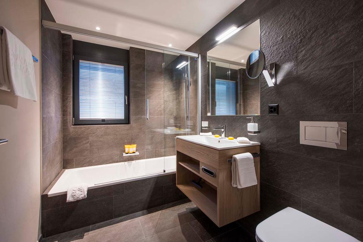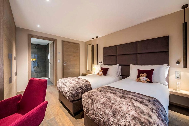The apartment includes three versatile bedrooms, which can be set up as twins or doubles. Each room is equipped with a TV, desk, and safe, along with an en-suite bathroom or shower room.