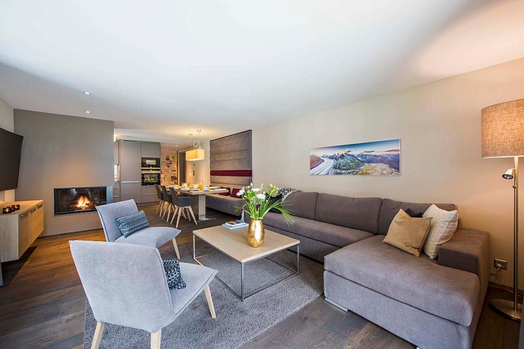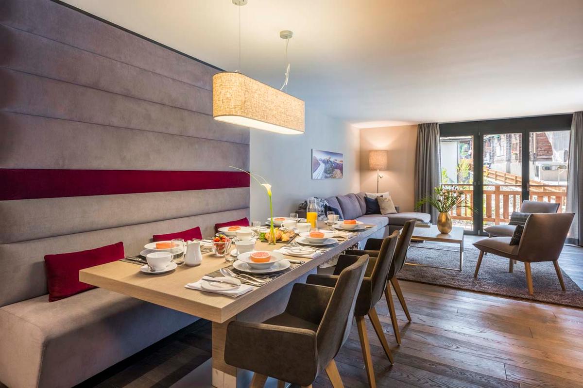 Magnificent views of the Matterhorn can be seen from the south-facing terrace, which is accessed through floor to ceiling glass doors that flood the room with natural light.