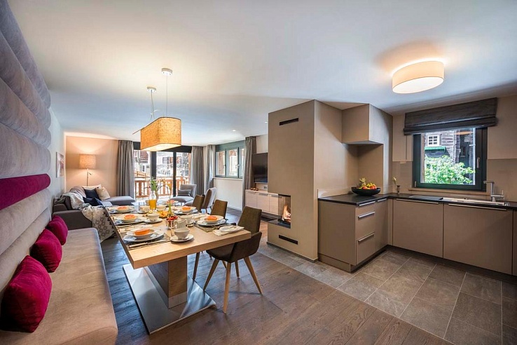 Zerm248 is conveniently located just 500 meters from the Matterhorn Glacier Paradise lift station and a short stroll from the village center. This prime location provides easy access to both the ski area and the numerous shops, bars, and restaurants. This three-bedroom apartment, which can host up to six people, is perfect for families seeking an elegant retreat in the heart of Zermatt.