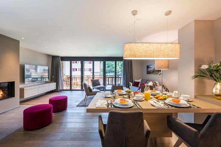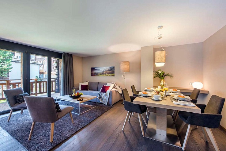 The apartment features a beautifully designed, open-plan living area with a fully equipped kitchen and dining table. You can unwind on the comfortable sofa in front of the large flat-screen TV, or step out onto the south-facing balcony for stunning views of the Matterhorn.