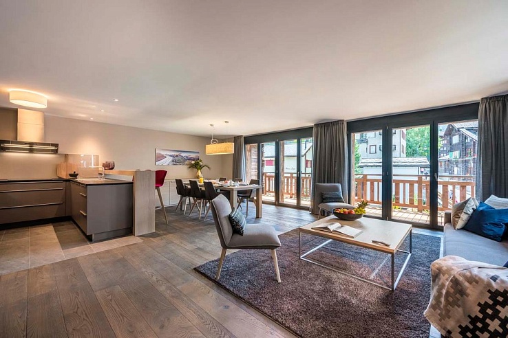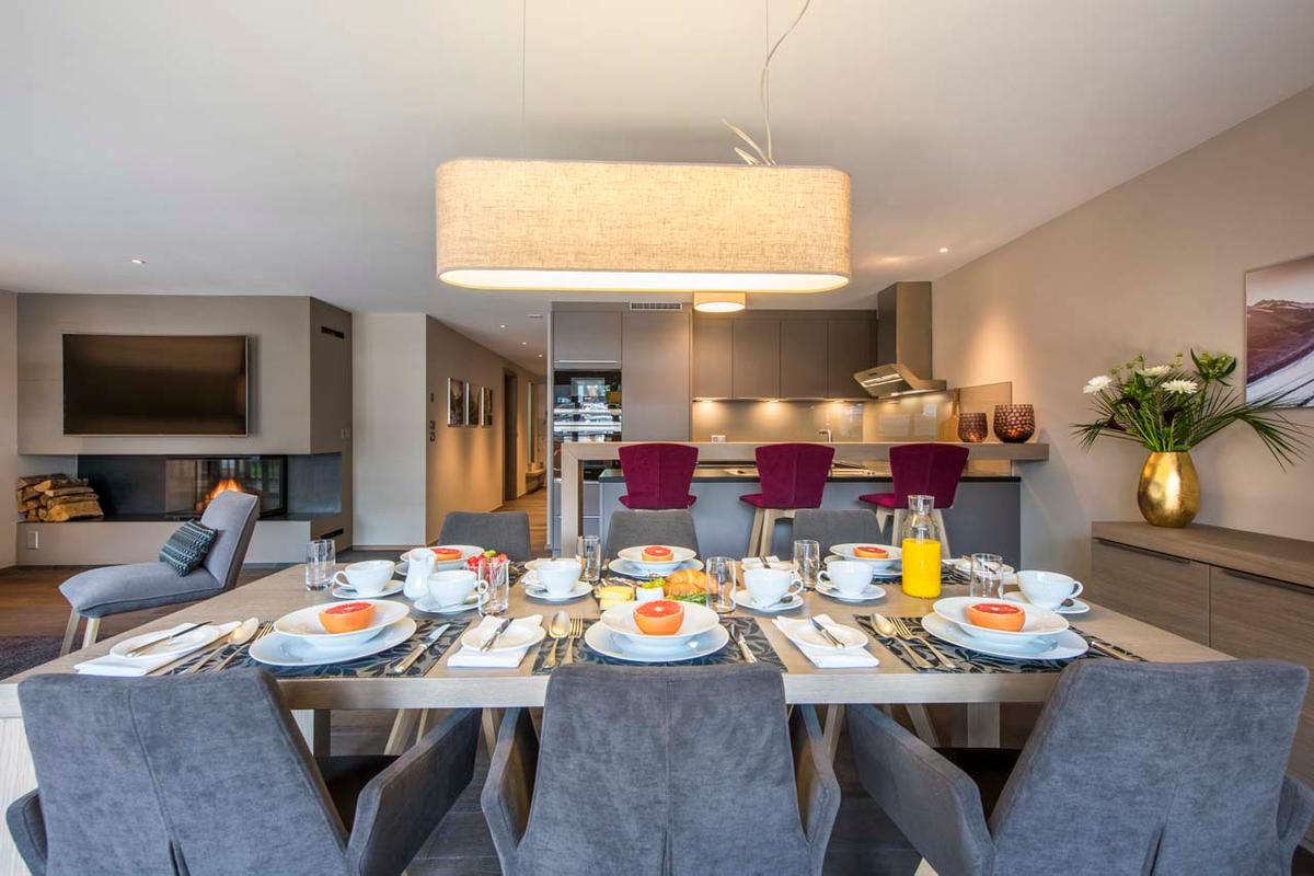 The residence expertly merges two three-bedroom apartments to form a luxurious six-bedroom space. The apartment features two open-plan living areas, each with a dining table, a fully-equipped kitchen with a breakfast bar, a flat-screen TV, a sofa, and a fireplace, creating a soothing and cozy atmosphere. French windows on both sides lead to balconies with stunning views of the Matterhorn.