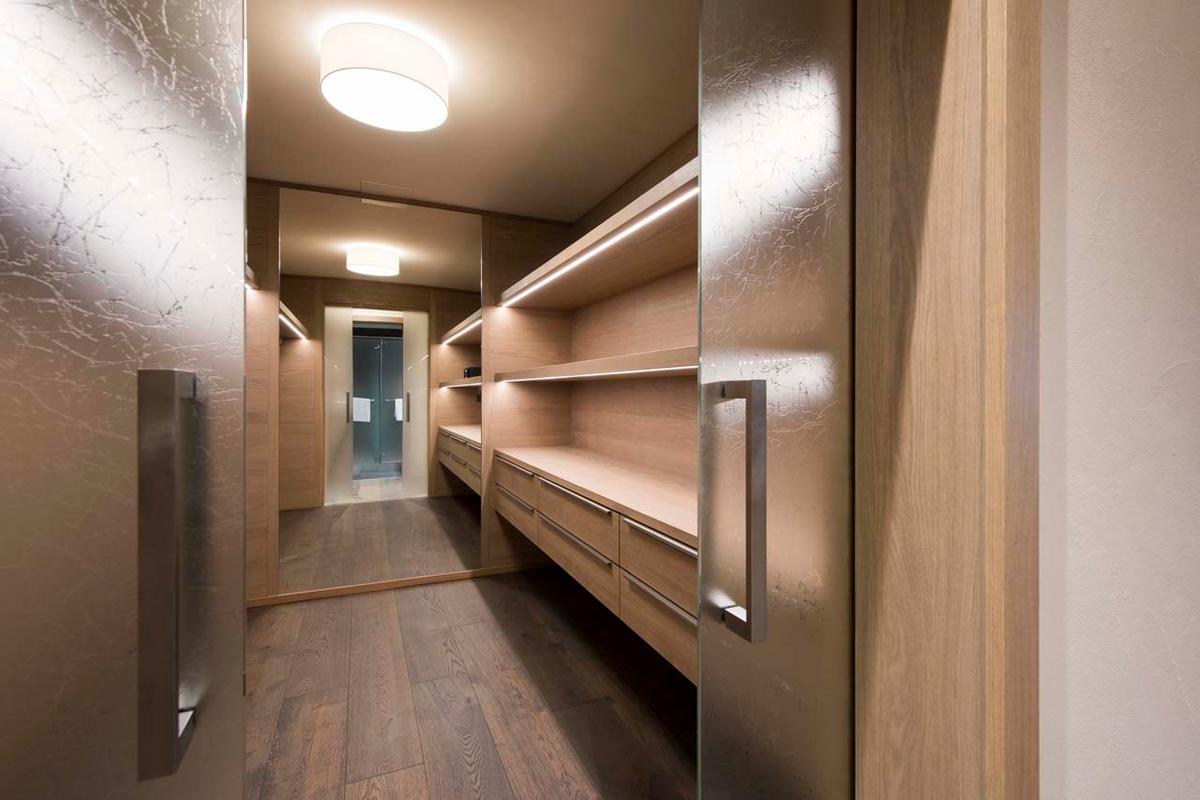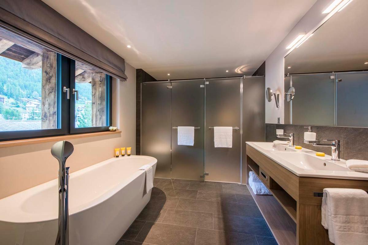 The penthouse's seven generous bedrooms are equipped with TVs, work desks, and safes. Each room features super-king beds, adaptable into twin configurations, and many boast private or shared terraces that offer breathtaking Matterhorn vistas. Two of these bedrooms can be interconnected with a shared bathroom, ideal for families seeking a private suite. The pinnacle of luxury is the master bedroom, which features a wood-burning fireplace and a spacious walk-in wardrobe.