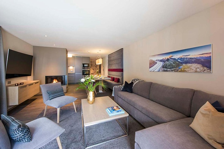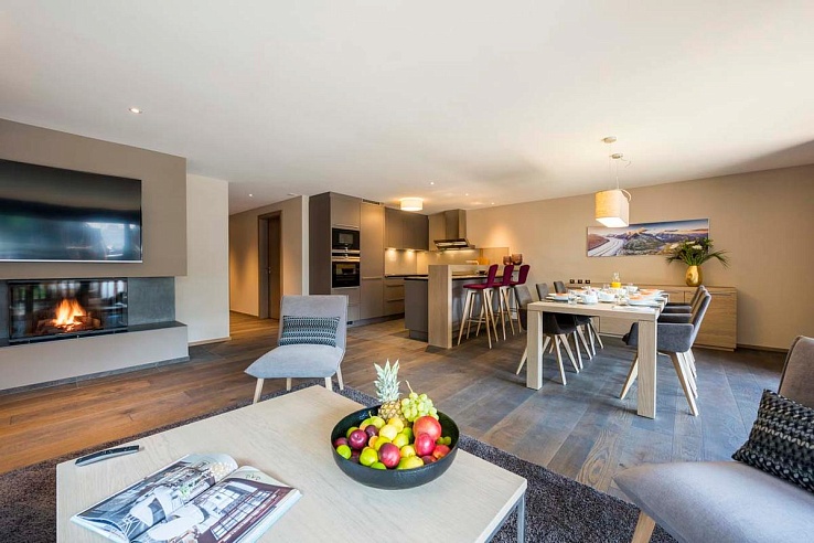 Each bedroom is equipped with super king-size beds that can be configured as twins, and most rooms offer either a private or shared balcony with Matterhorn views. All bedrooms have their TVs, in addition to the main TV in each living area.