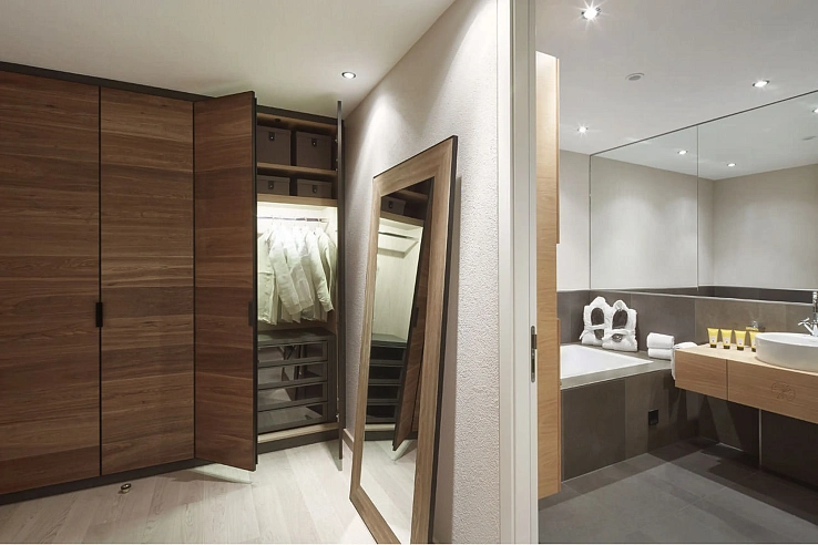 The master suite is a haven of space, featuring a sumptuous double bed, a generous dressing room, and a sleek bathroom complete with a bathtub and rain shower. The second bedroom is elegantly appointed with twin beds, its own dressing area, and a modern en-suite shower room. Both rooms are designed as serene sanctuaries, offering privacy and luxury with high-end finishes and ample storage.
