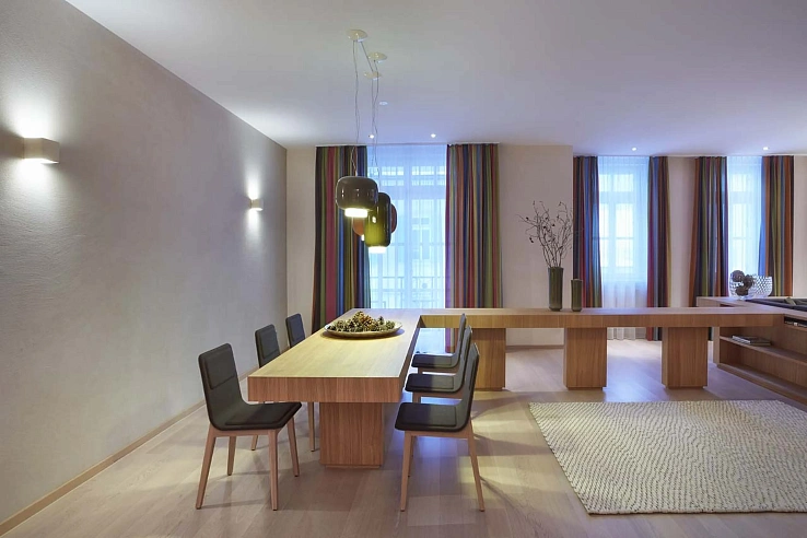 Thoughtfully furnished with bold accents and unique pieces, this 230m² apartment offers a spacious open-plan living and dining area centered around a welcoming fireplace. The signature 'L'-shaped dining table flows effortlessly into the lounge, creating an ideal space for convivial evenings. Large balconies on two sides frame breathtaking panoramic views of the Engadin Valley, while a fully equipped kitchen featuring a Nespresso machine, steam oven to every culinary need.