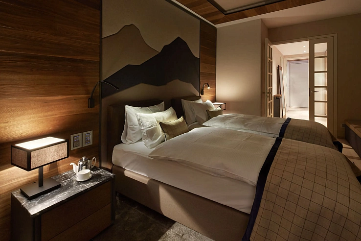 Designed for ultimate comfort and privacy, all three bedrooms are en-suite. Two elegant doubles and one twin bedroom each feature their own terrace access, dressing areas, and ample closet space. The bathrooms are appointed with luxurious rain showers and bathtubs, ensuring a spa-like experience within your private retreat. The seamless blend of warm wood, plush textiles, and thoughtful design creates a serene alpine haven.