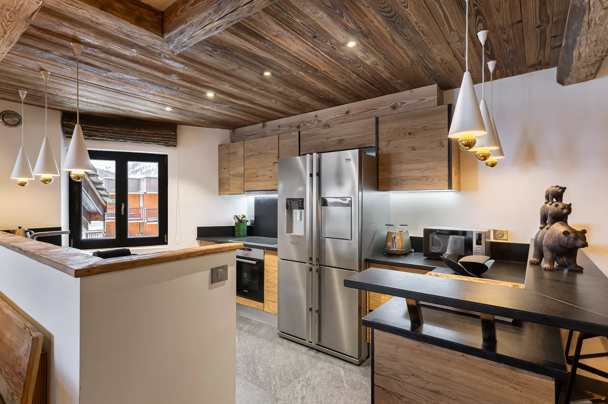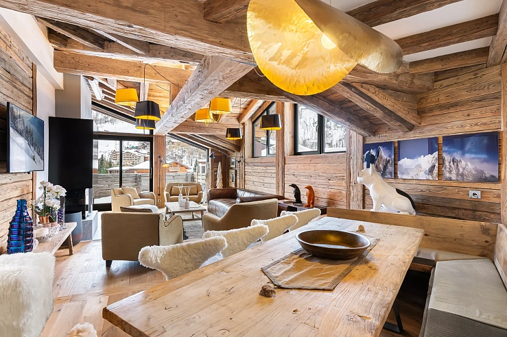 The open-plan living area is the social heart of the penthouse, where vast, double-height windows frame spectacular mountain views and flood the space with light. Traditional wooden beams contrast elegantly with contemporary furnishings, creating a warm and inviting atmosphere. After a day on the slopes, gather on the plush sofas around the modern fireplace or step out onto the panoramic balcony to watch the torchlight descents.