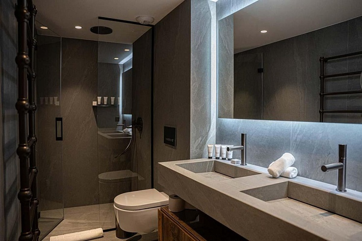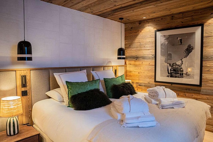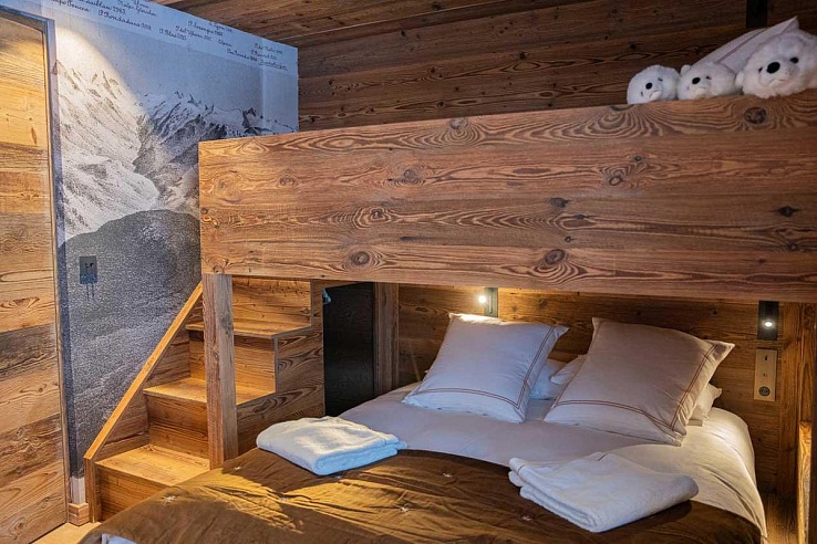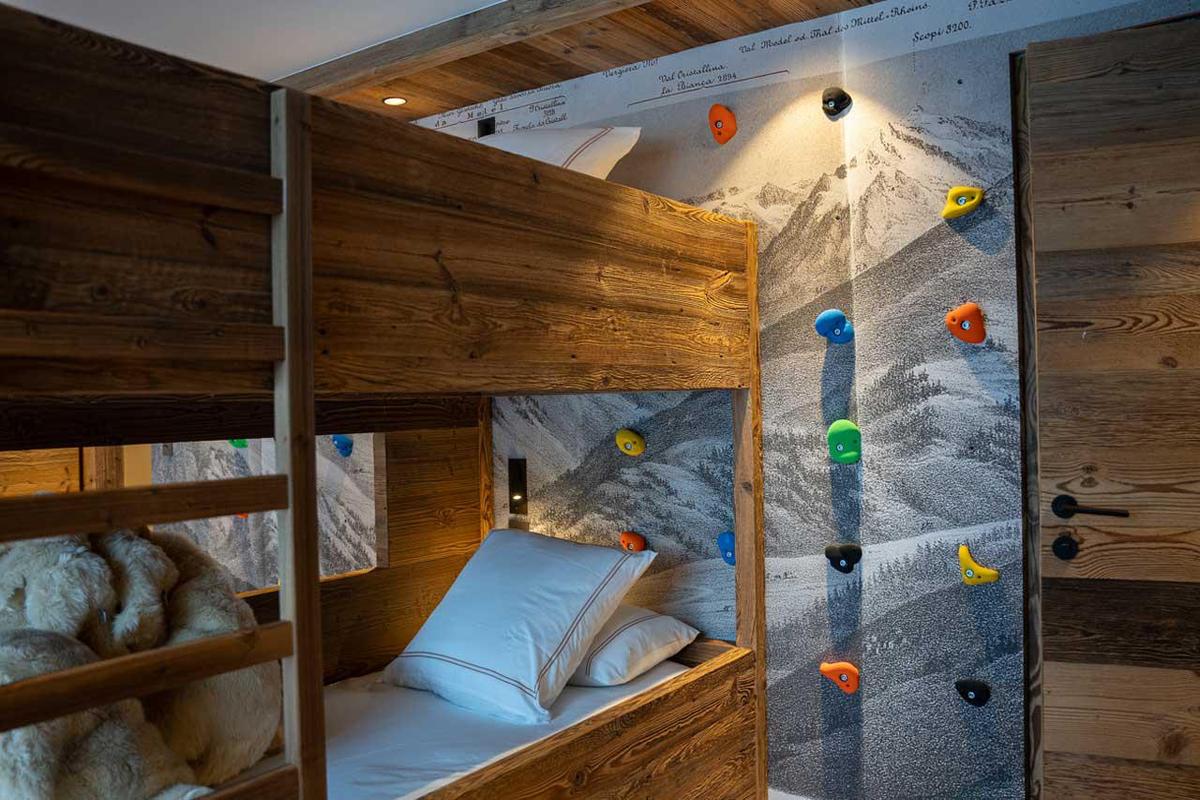 Chalet Altitude comfortably hosts up to 17 guests (14 adults and three children) across six double bedrooms and a dedicated children’s dormitory. Each double room is furnished with a king-size bed and an en-suite shower room, while the bunk room includes a queen-size bottom bunk and a single-top bunk. Several bedrooms also provide access to a balcony or terrace.