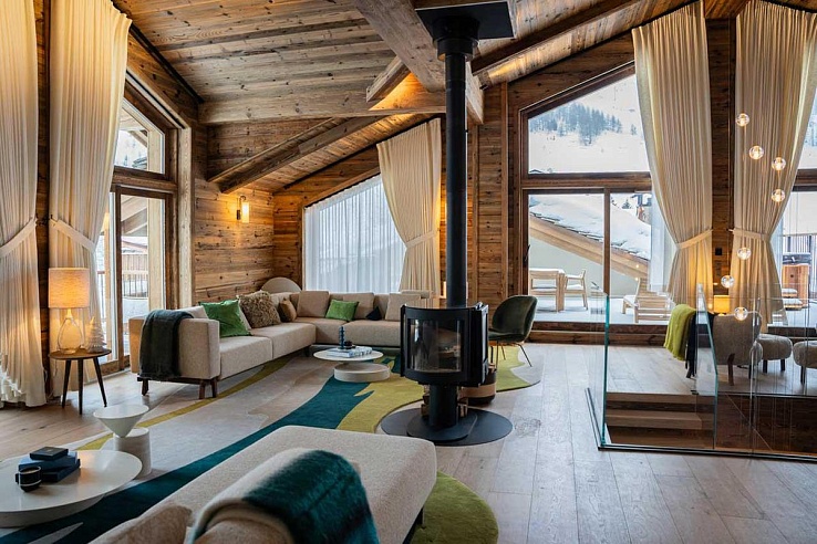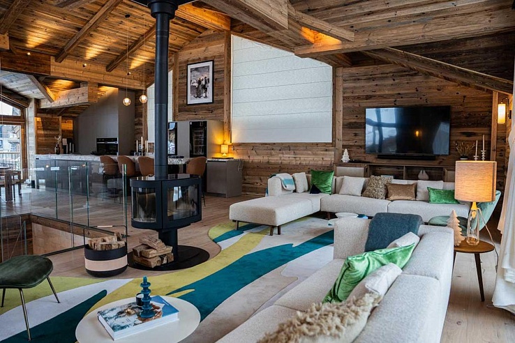 A private elevator leads to the top-floor open-plan living area, where high ceilings, breathtaking views, and a striking central wood-burning fireplace set the scene for relaxation after a day on the slopes. The space also features an elegant dining area, a fully equipped kitchen, and an impressive wine cellar with a bar.