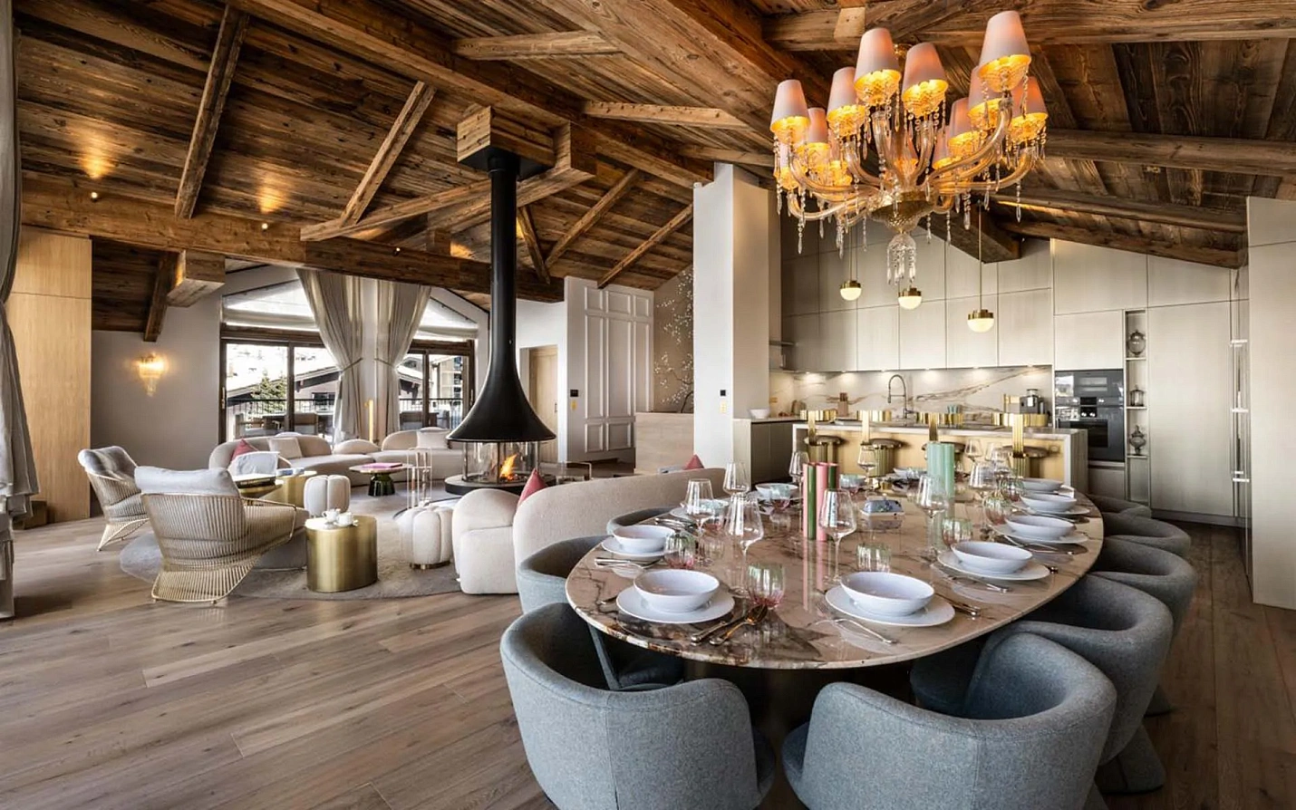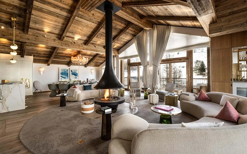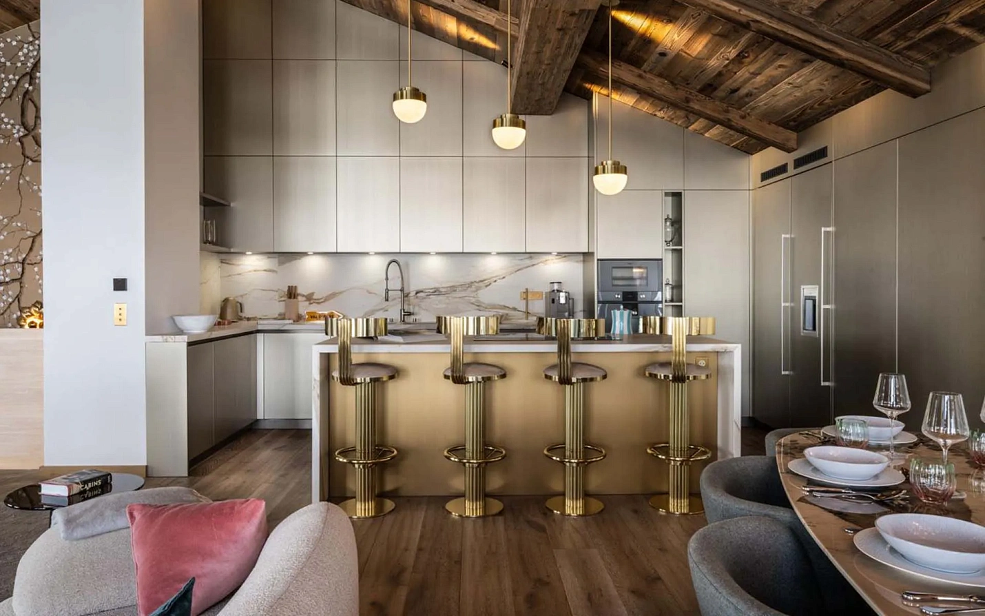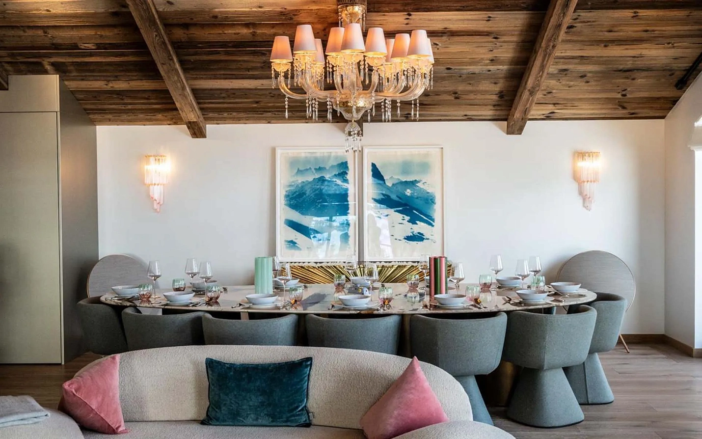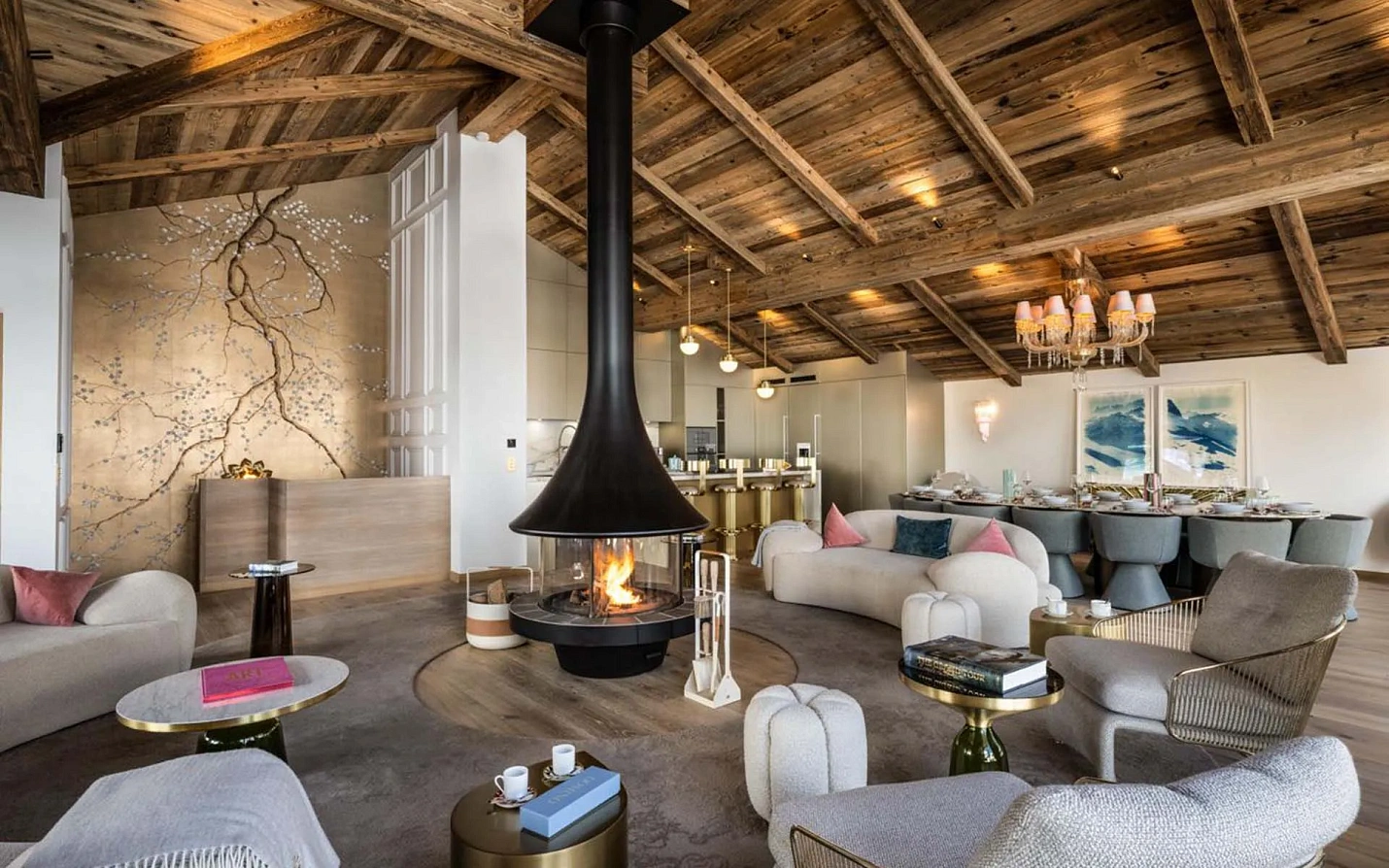 Ascend to a world of refined chalet living where contemporary design meets alpine tradition. The breathtaking open-plan living area, crowned with wooden-beamed vaulted ceilings and flooded with light from floor-to-ceiling windows, creates a magnificent space for gathering. Here, a stylish lounge with sumptuous seating surrounds a modern stove, while an elegant dining area with statement lighting sets the stage for memorable meals. The apartment's chic interior is defined by a neutral and blush palette, accented with Chinoiserie-style wallpapers, sheepskin rugs, and earthy tones for a warm, sophisticated atmosphere.