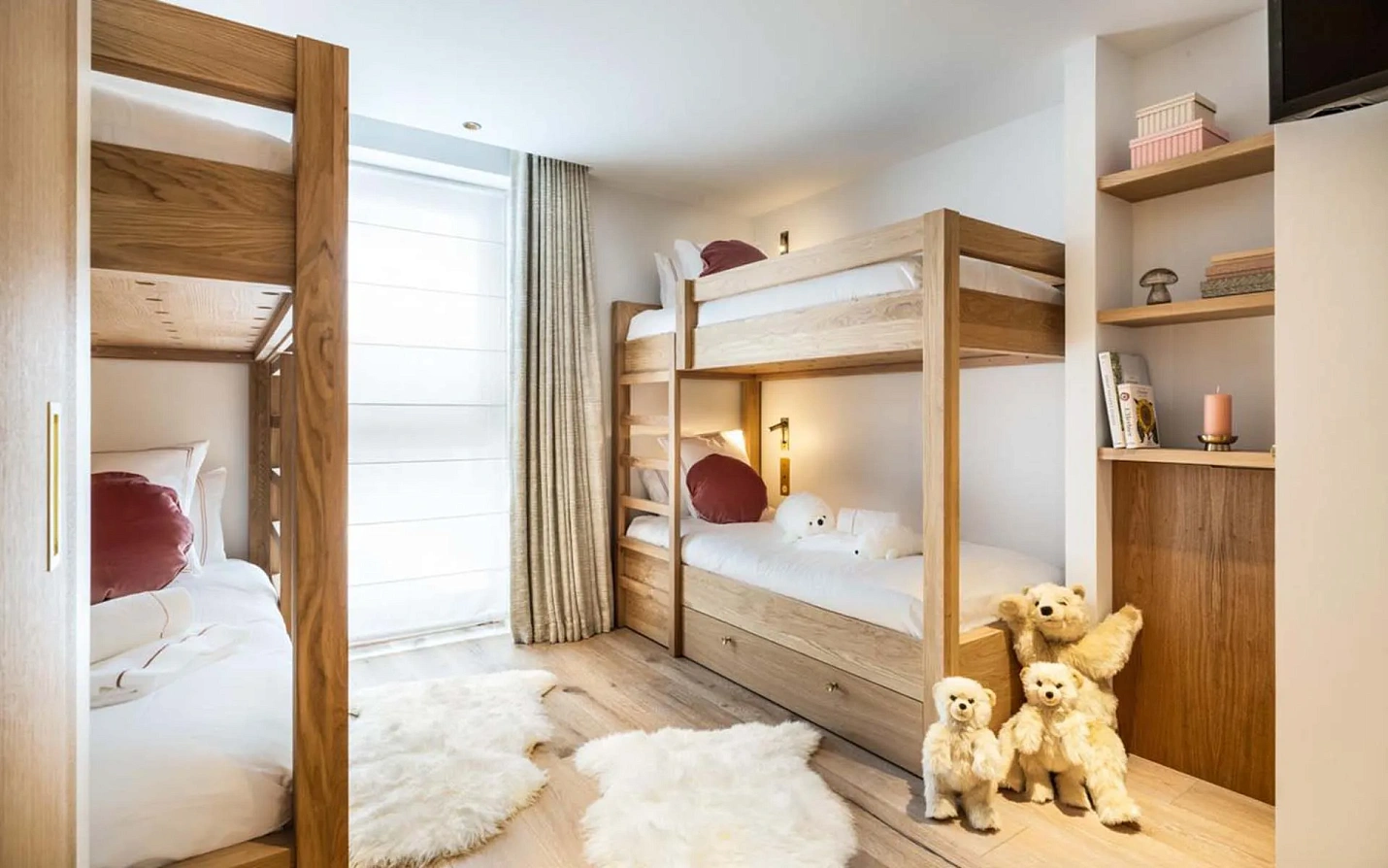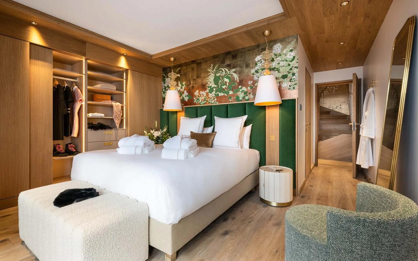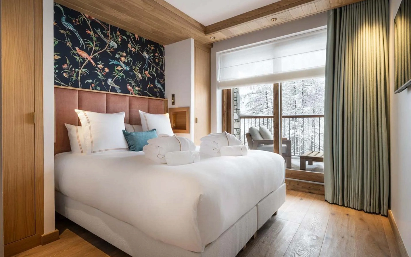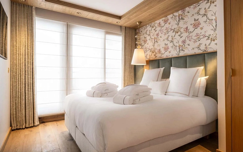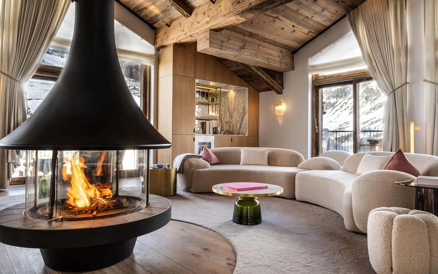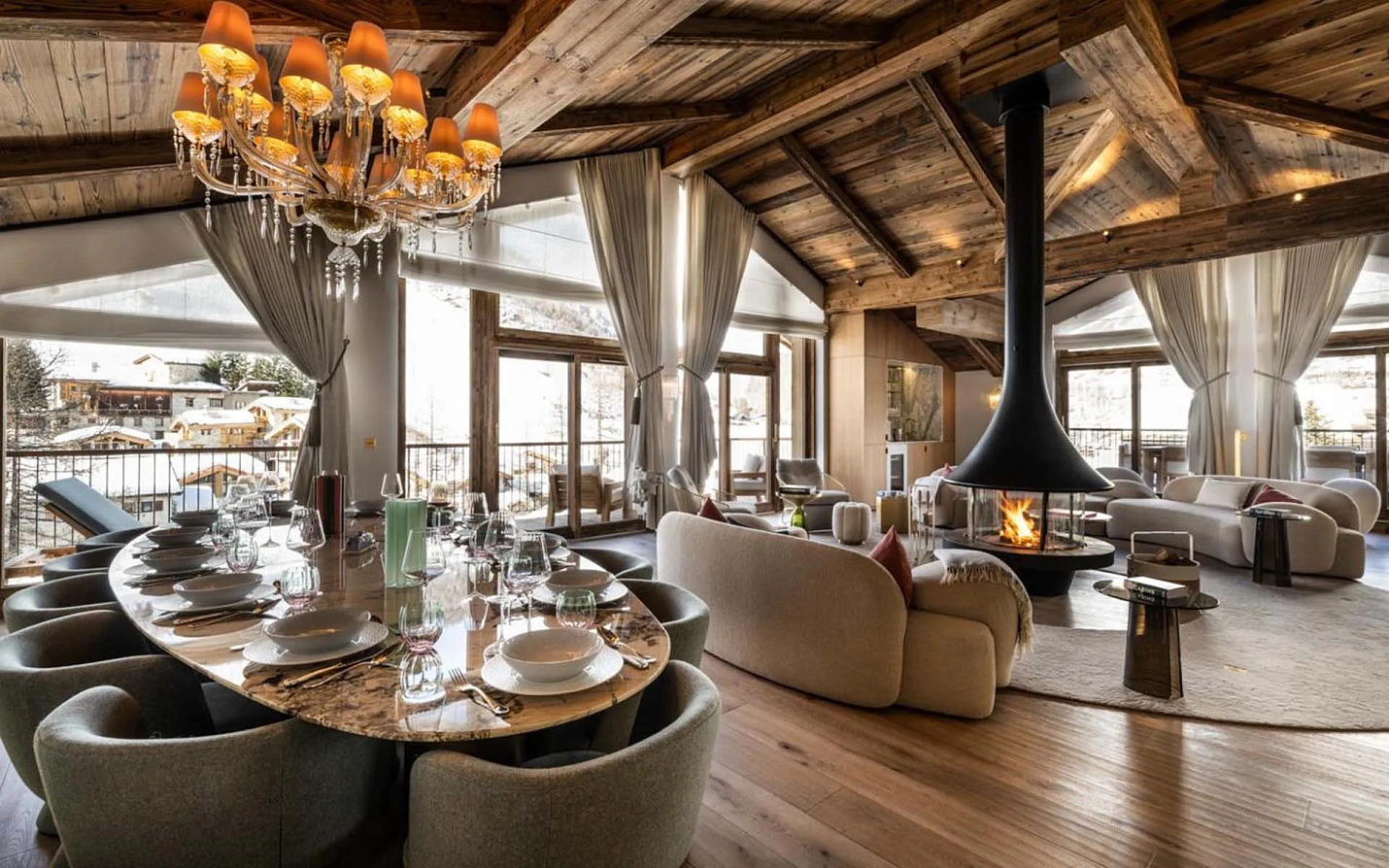 Ascend to a world of refined chalet living where contemporary design meets alpine tradition. The breathtaking open-plan living area, crowned with wooden-beamed vaulted ceilings and flooded with light from floor-to-ceiling windows, creates a magnificent space for gathering. Here, a stylish lounge with sumptuous seating surrounds a modern stove, while an elegant dining area with statement lighting sets the stage for memorable meals. The apartment's chic interior is defined by a neutral and blush palette, accented with Chinoiserie-style wallpapers, sheepskin rugs, and earthy tones for a warm, sophisticated atmosphere.
