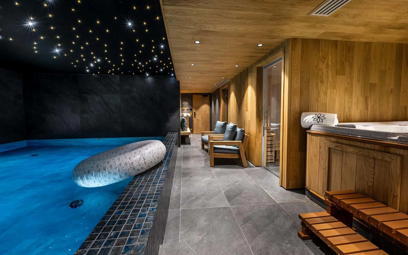 This 326m² tri-level residence features a heated indoor pool, outdoor Jacuzzi, sauna, steam room, and a private cinema. Enjoy sublime mountain views from expansive balconies, relax by the wood-burning fireplace, and savor moments in the well-equipped wine cellar.