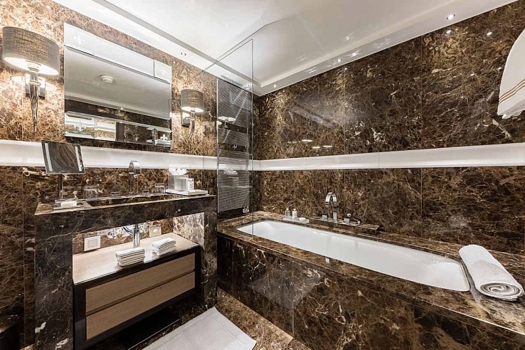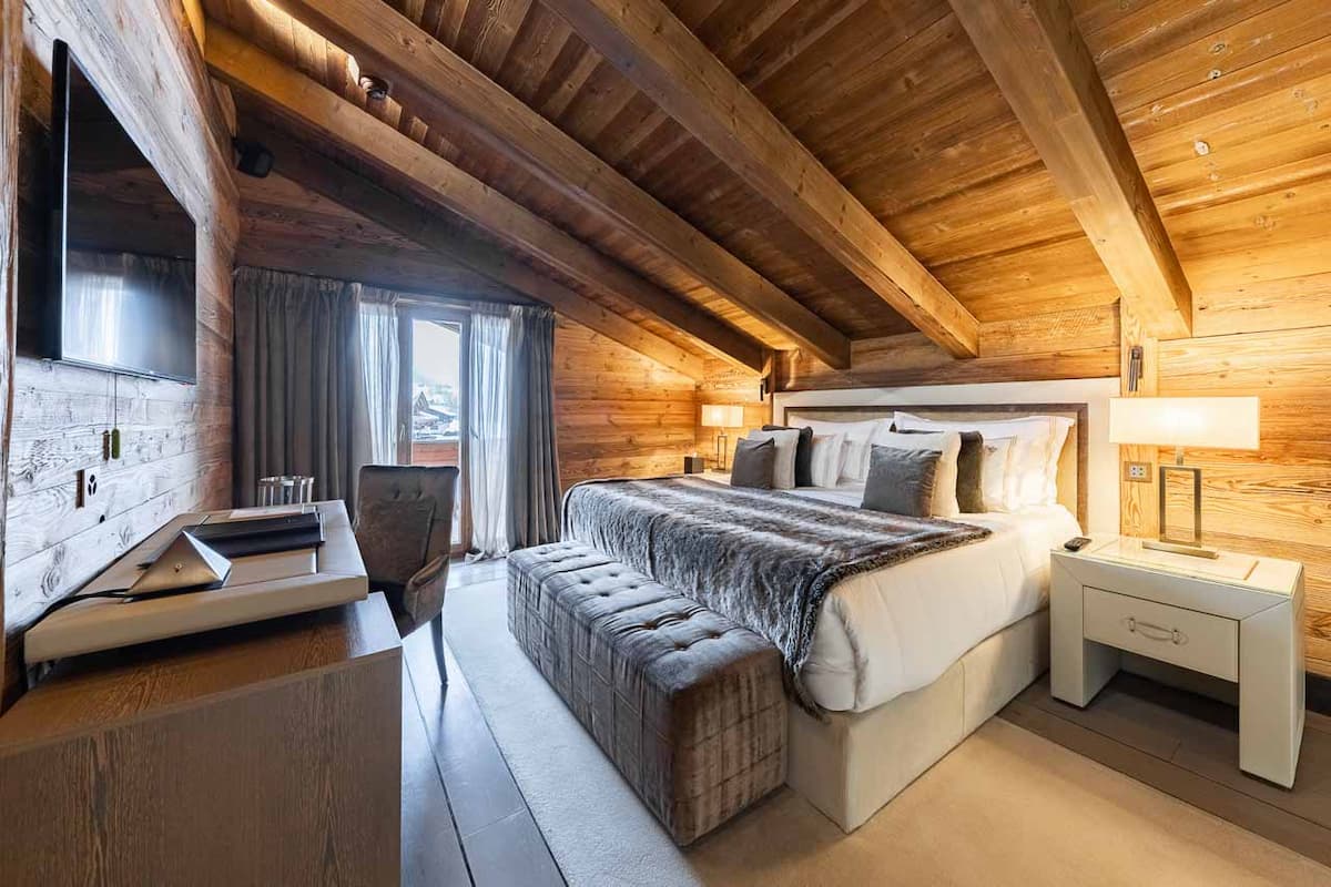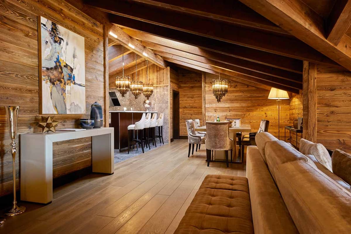 Rest and rejuvenation define the private quarters. Bedrooms are sanctuaries of calm, featuring sumptuous king-sized beds, generous walk-in wardrobes, and en-suite marble bathrooms designed for pure indulgence. The elegant interiors, adorned with curated art and rich textures, ensure each suite offers a serene retreat after a day on the slopes or exploring Gstaad.