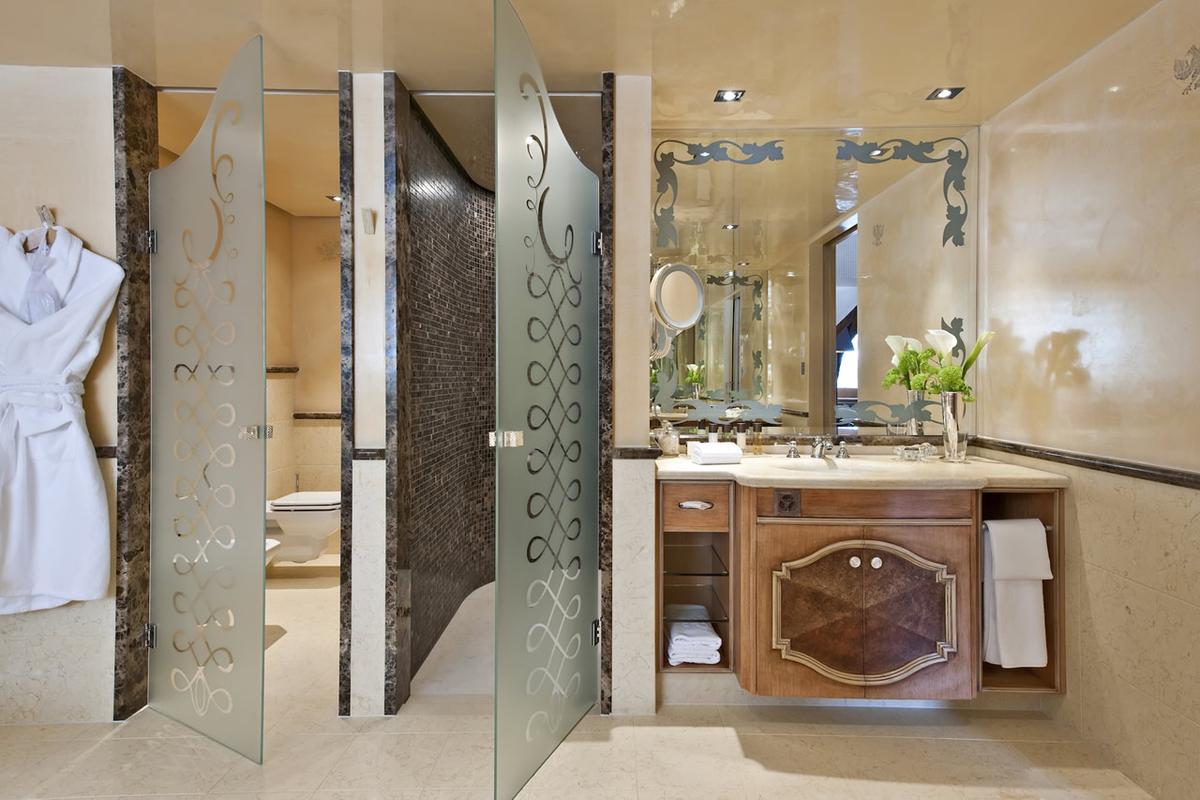 Experience unparalleled rest in three light-filled, king-bedded sanctuaries. Each bedroom is a testament to alpine elegance, featuring sumptuous furnishings, Venetian stucco ceilings, Murano glass lamps, and Berluti leather headboards. Step directly onto private balconies or terraces to greet the mountain dawn. Indulgence continues in the en-suite marble bathrooms, appointed with deep soaking tubs, invigorating rain showers, double vanities, and underfloor heating. The master suite further pampers with a dedicated walk-in wardrobe.
