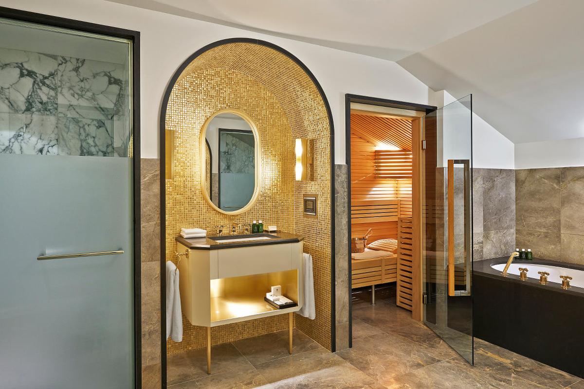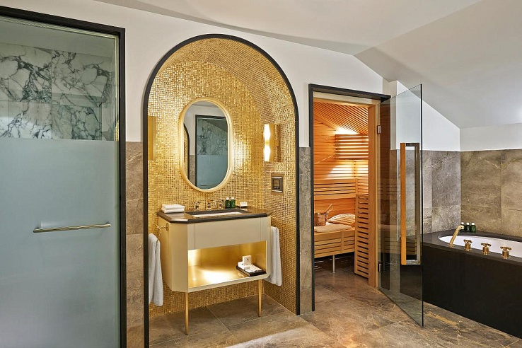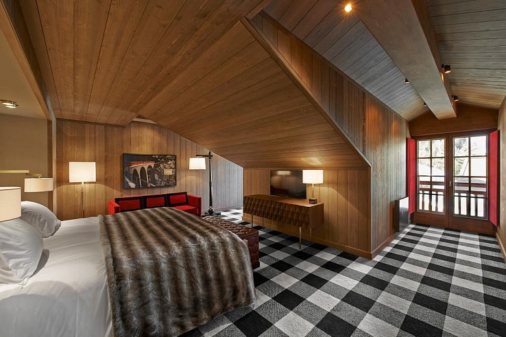 The master bedroom is a true retreat, complete with an indoor Jacuzzi, sauna, and steam bath. Guests can also enjoy a hot tub on the roof terrace, engaging themselves in the picturesque snowy Alpine scenery. The penthouse includes a private balcony that offers stunning views of the Courchevel valleys. Additionally, direct access to the hotel's relaxing spa and swimming pool, the slopeside restaurant, the bar, and the exceptional Japanese gourmet restaurant, Koori, is enjoyed by guests of L’Apogée.